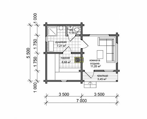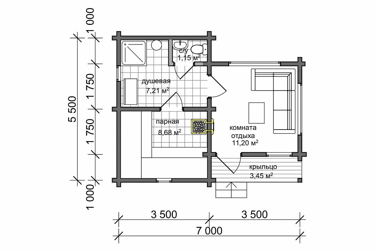 Внутренние помещения разделены функционально на две зоны – комната отдыха и банная часть. В комнате отдыха выполнены панорамные окна и подшив потолка под стропила, что придает помещению максимальную освещенность и ощущение простора и воздуха. Здесь можно разместить стол для чаепития и диван для отдыха после парения. Банная зона включает душевую и парную. Оба помещения достаточно просторные, в душевой можно устроить отдельный санузел, душевую лейку, обливное ведро, поставить деревянную купель. В помещении парной разместится широкий г-образный полог с двумя ярусами.