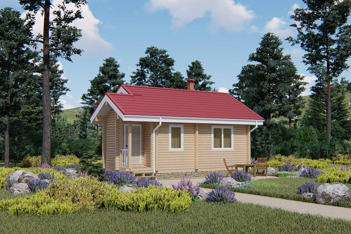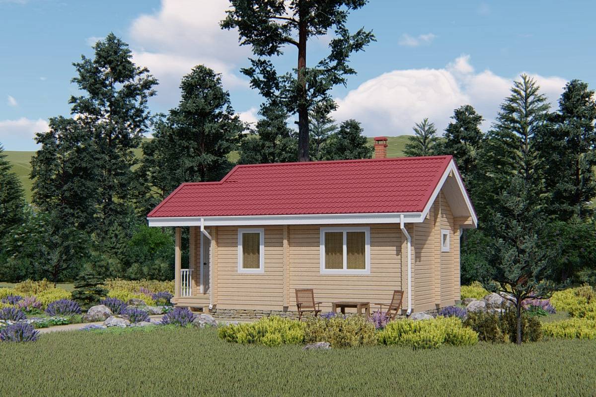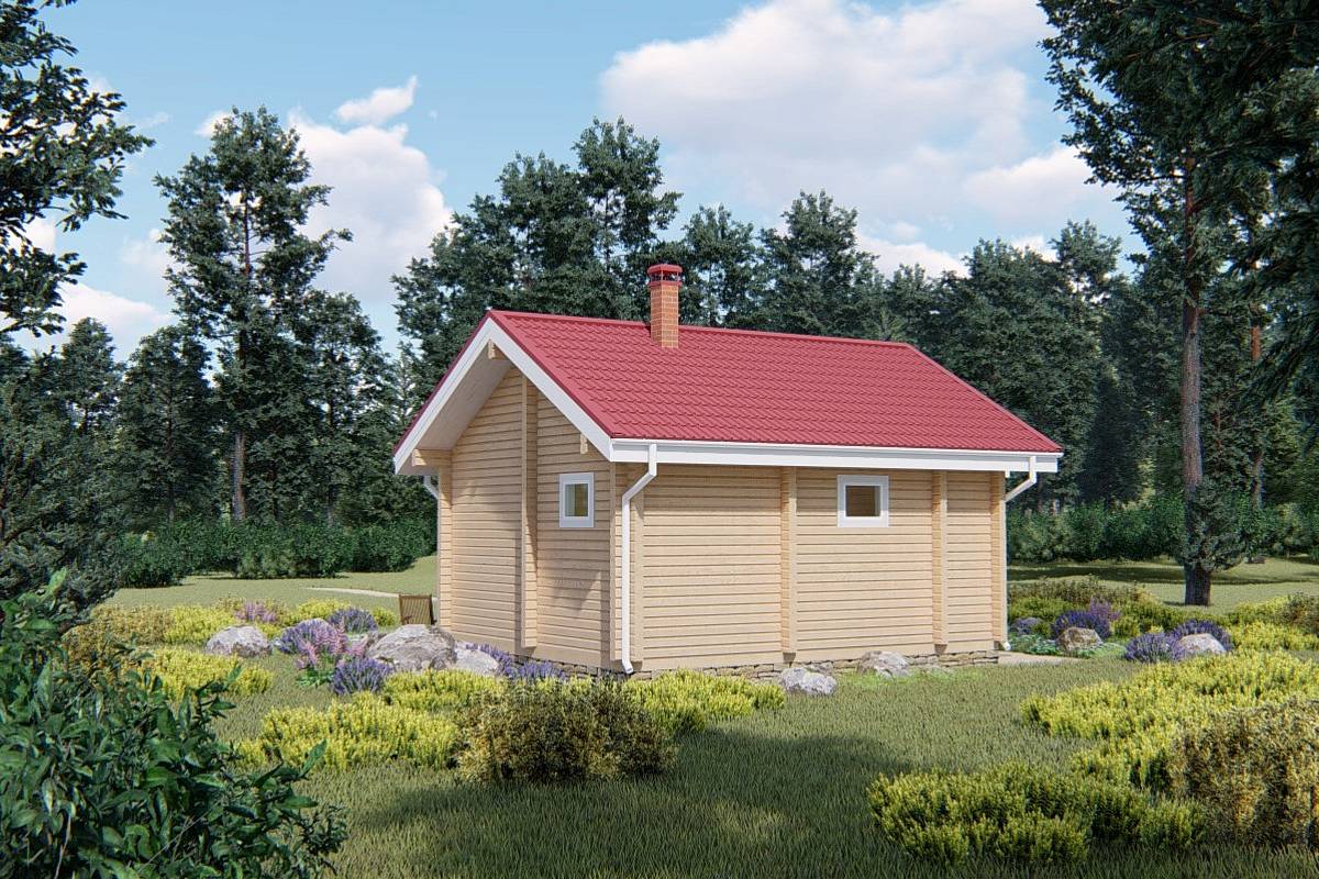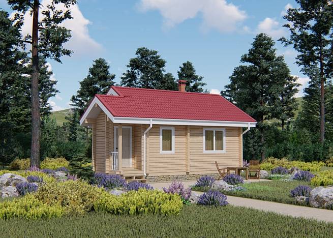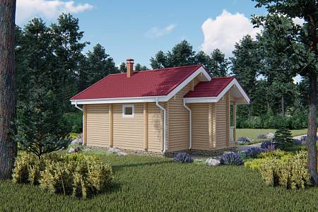 Вход в баню организован через крыльцо, защищающее от ветра и дождя, далее через тепловой тамбур попадаем в раздевалку. Здесь удобно снять верхнюю одежду и обувь. В комнате отдыха поместится небольшой кухонный гарнитур, обеденный стол, диван для отдыха. Банная часть представлена санузлом, душевой, где предусмотрен душ, обливное ведро и еще останется место для деревянной купели. Сердце бани – парное помещение, в котором запроектирован г-образный полог в 2 яруса, печь устроена таким образом, что ее топка выходит в комнату отдыха, образуя там портал камина.