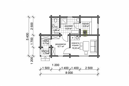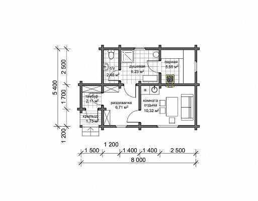 Проект бани с расширенным составом помещений. Выполнен из профилированного бруса, имеет габариты 5,4х8,0 м.