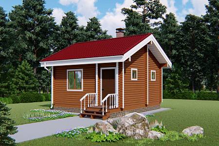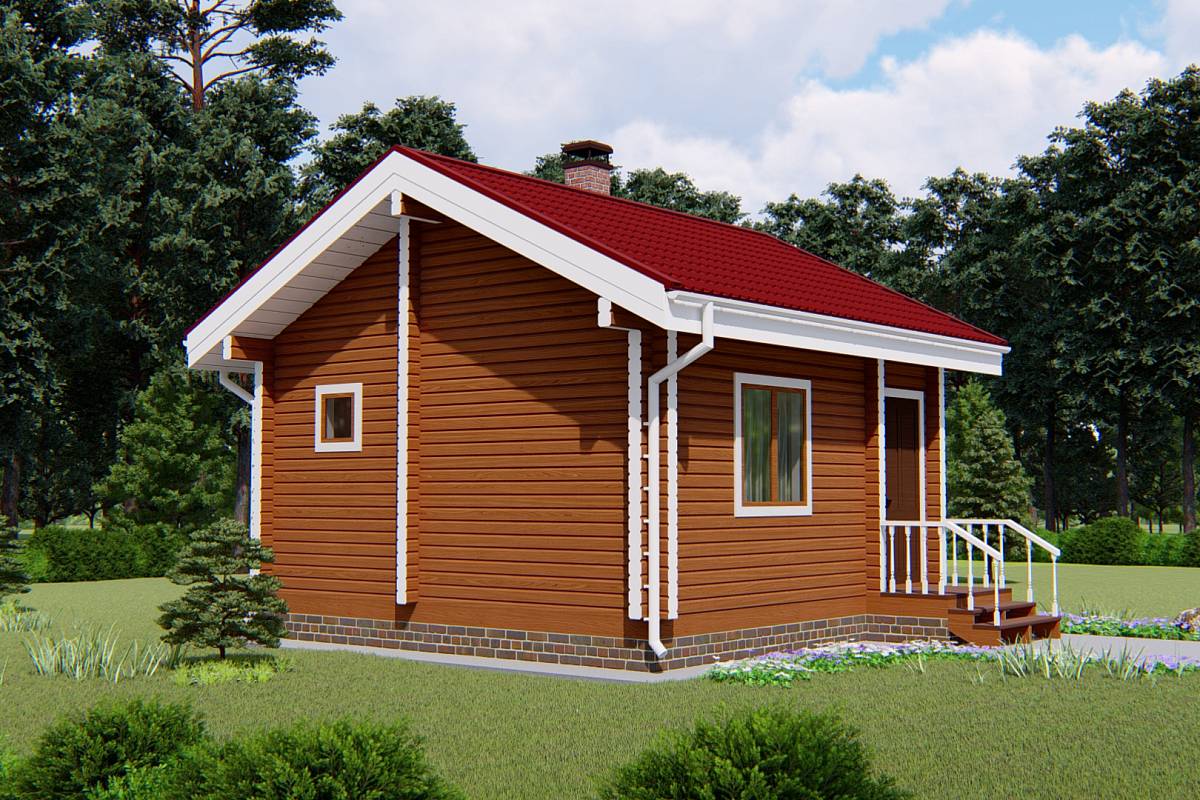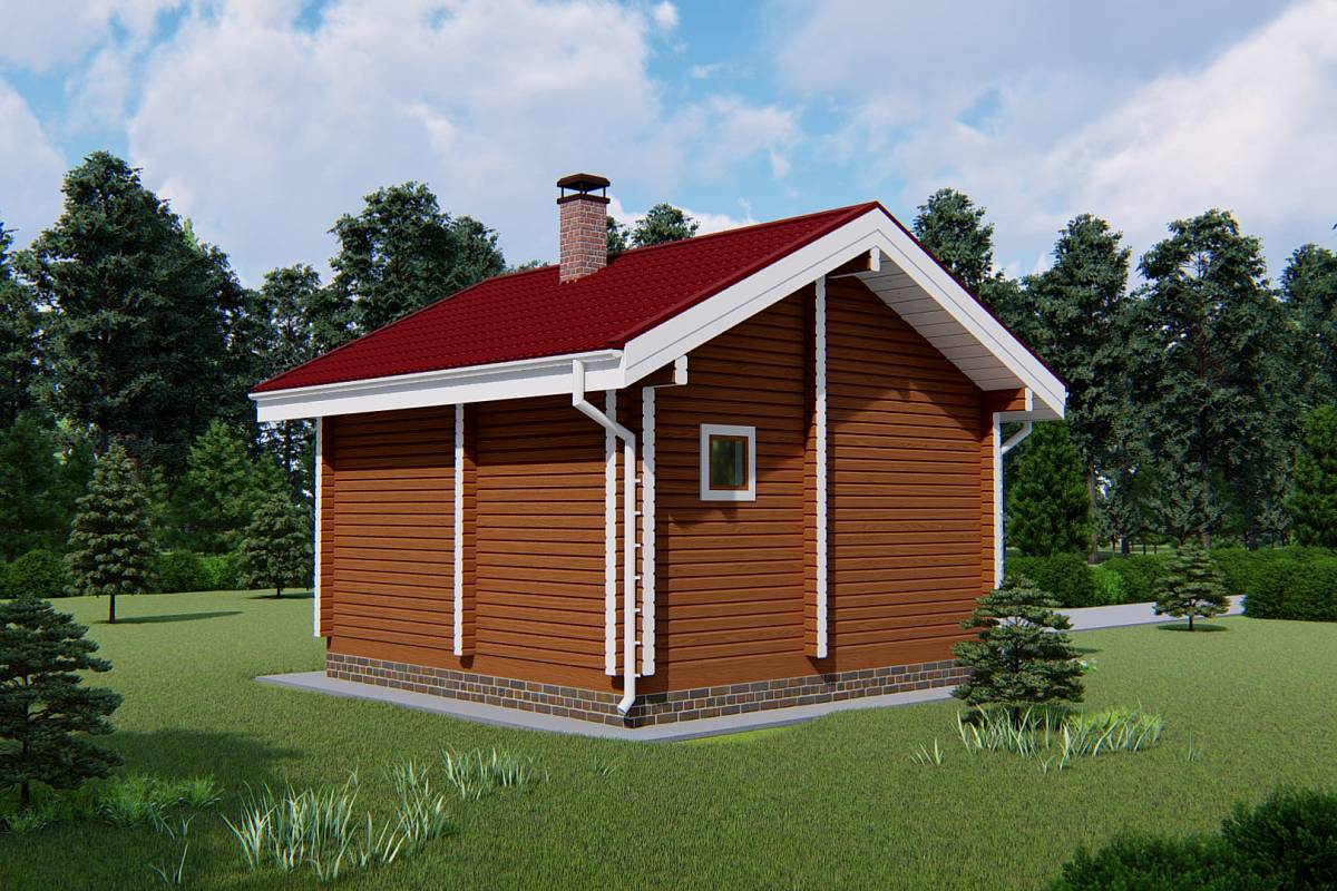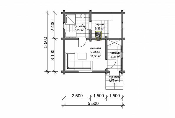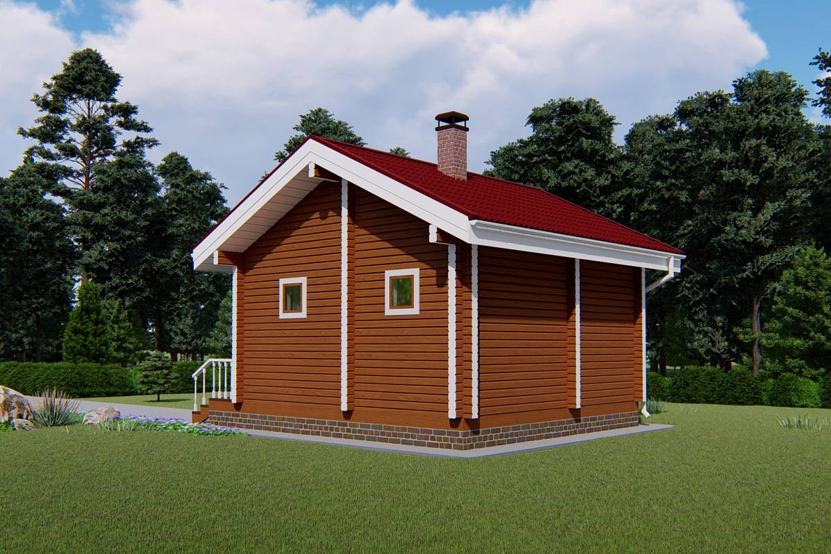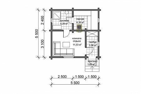 Баня из профилированного бруса с габаритами 5,5х5,5 м. Такие размеры позволяют при производстве бруса выполнить распиловку с минимальными отходами.