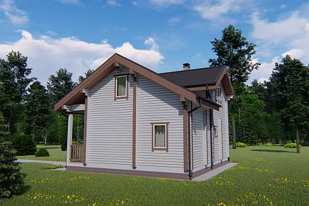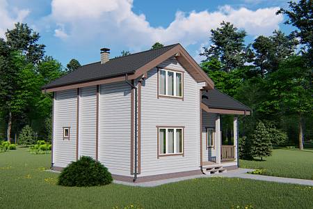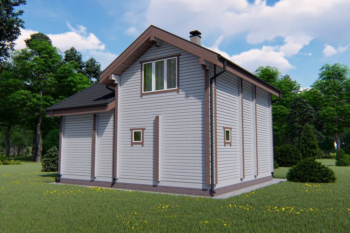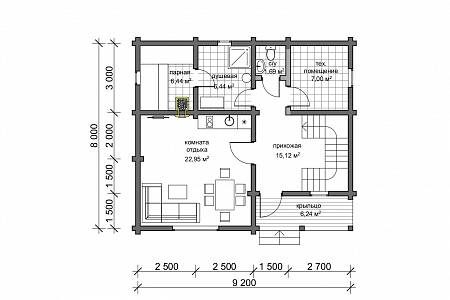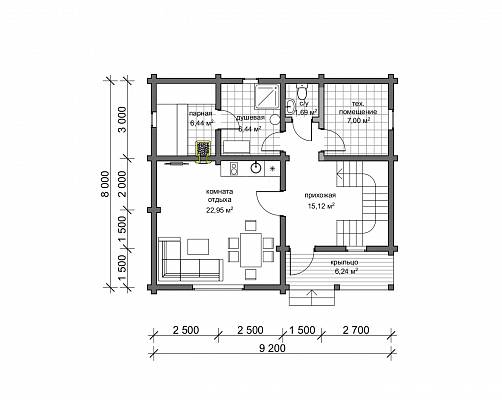 На входе в дом организовано крыльцо, которое защищает от осадков и ветра, также здесь можно разместить садовые кресла, небольшой столик. В прихожей спроектирована удобная лестница на второй этаж. Комната отдыха в данном проекте 20 м.кв., что позволит здесь разместить мягкую зону с просмотром телевизора, кухонный гарнитур и обеденный стол. Банная часть представлена небольшим санузлом, душевой и парной. Также есть техническое помещение для расположения необходимого оборудования. Сердце бани – парная. Печь размещается в данном проекте с выходом топкой в комнату отдыха.
