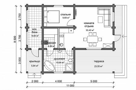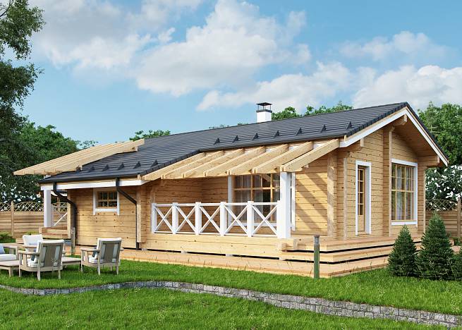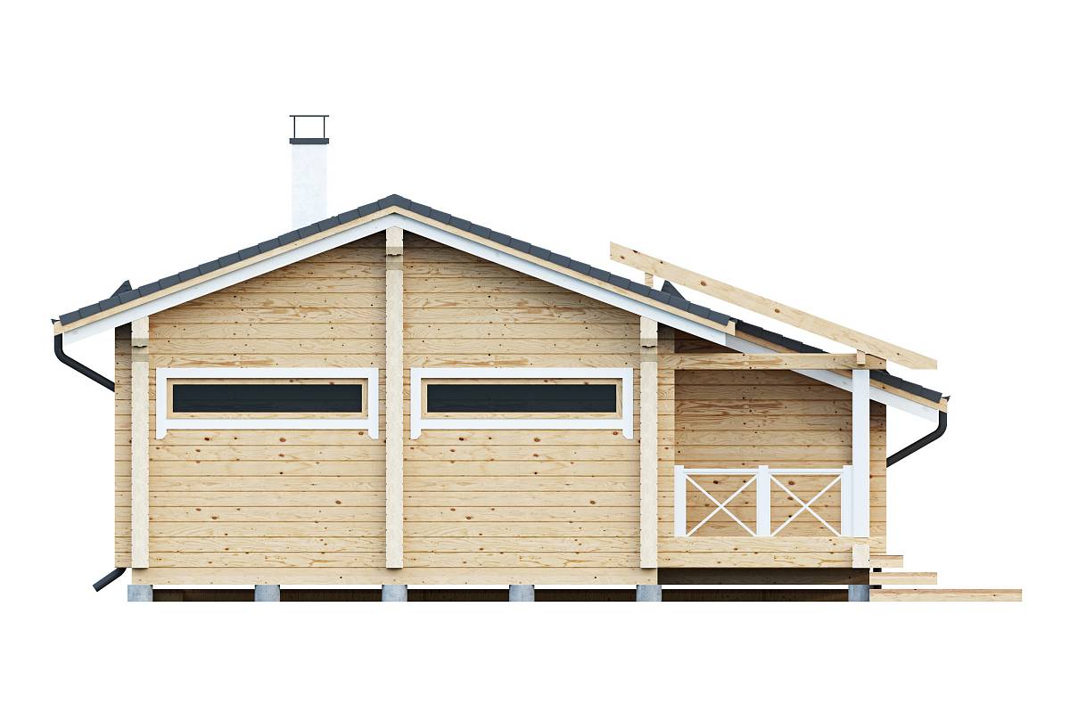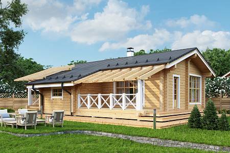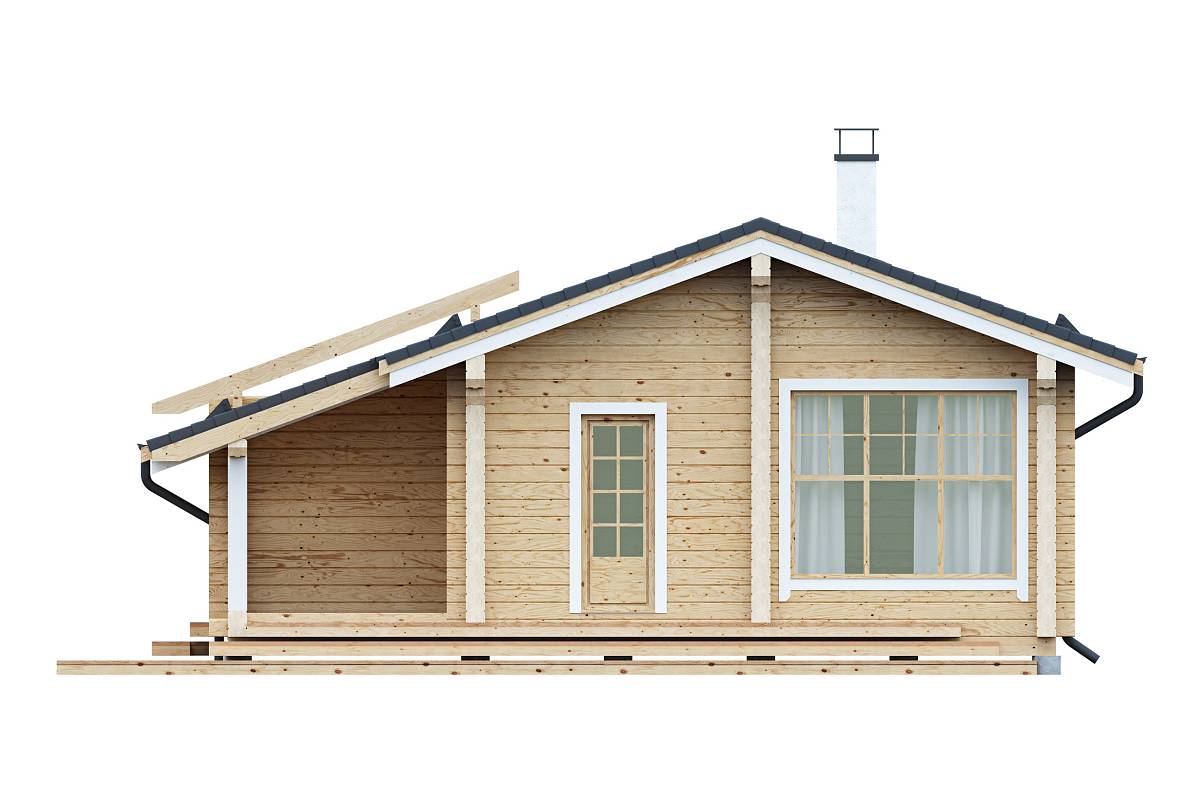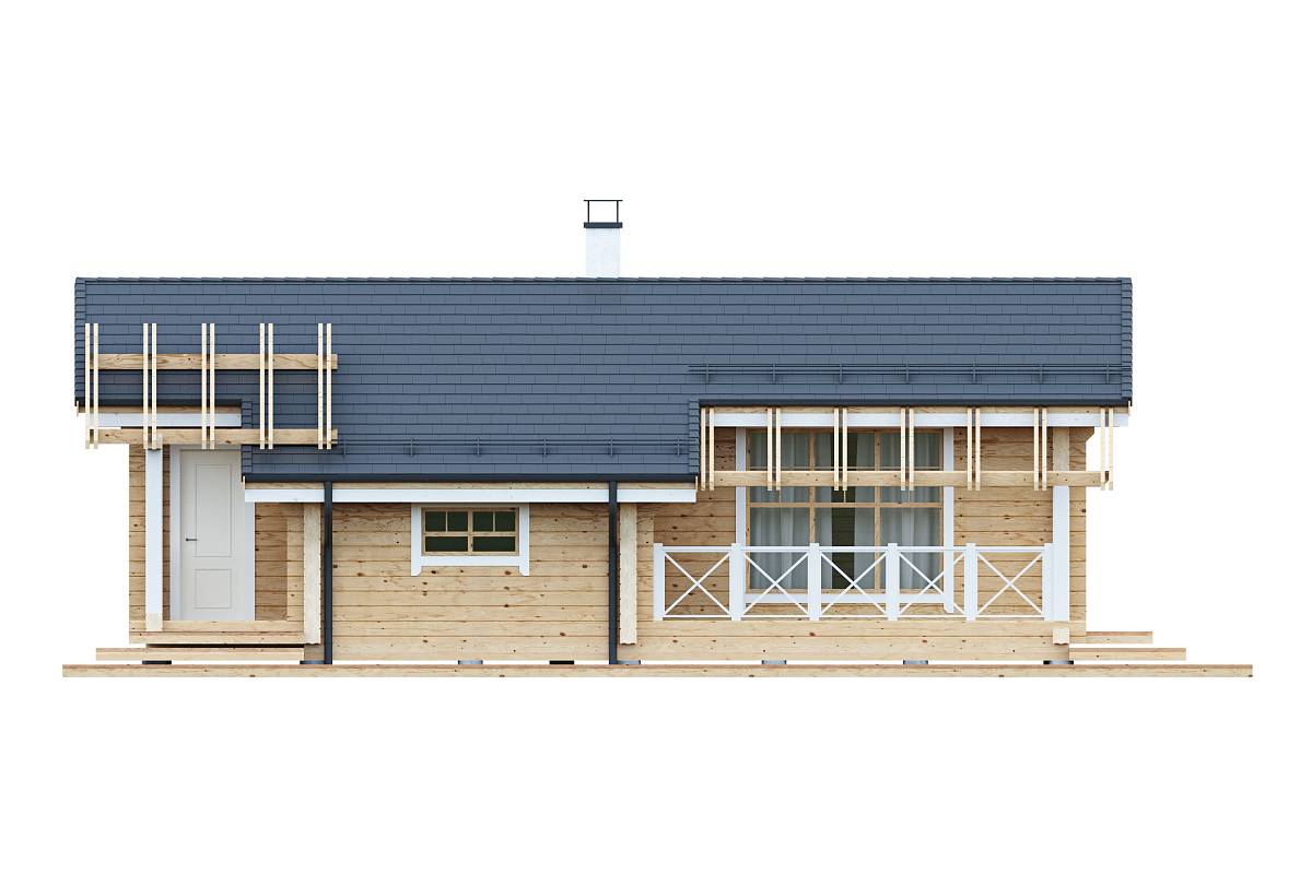 Компактный проект деревянного дома из бруса. Представляет собой одноэтажный объем с утепленной кровлей. Подойдет в качестве дачного дома сезонного проживания.