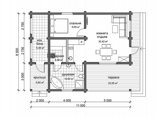 Планировочное решение имеет все необходимые помещения для комфортного отдыха. Вход в дом организован с террасы, гостиная просторная, совмещена с кухонной зоной арочным проемом. Ванная комната предусматривает размещение душа, ванны, раковины, унитаза, здесь же есть возможность разместить стиральную машину, шкаф для хранения бытовых приборов и химии. В спальне можно разместить двуспальную кровать, плательный шкаф, небольшой письменный стол. Планировкой предусмотрено помещение хозяйственного назначения, которое имеет отдельный вход с улицы.