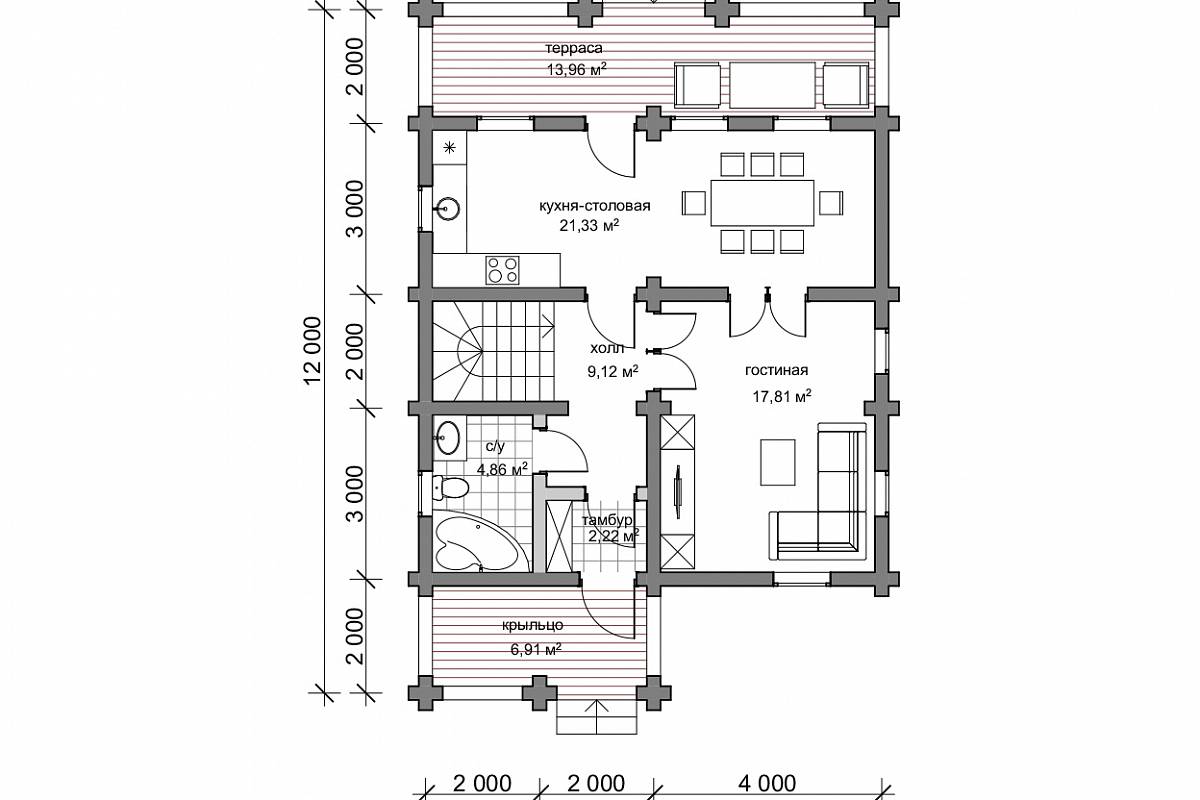 Планировочное решение лаконичное, под каждую функцию выделено свое пространство. Вход в дом организован с крыльца, через тепловой тамбур. Холл с лестницей играет роль распределительного помещения, из него можно попасть в кухню, санузел, гостиную. Также организовано отдельное помещение столовой для размещения большого обеденного стола.