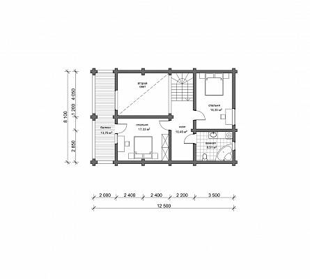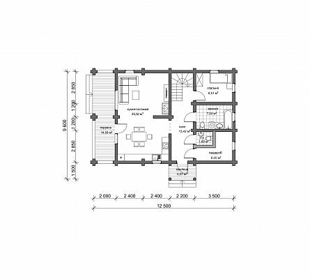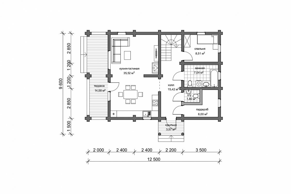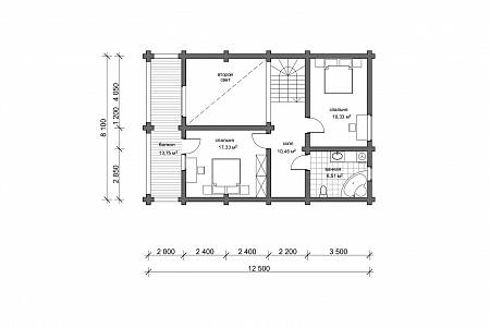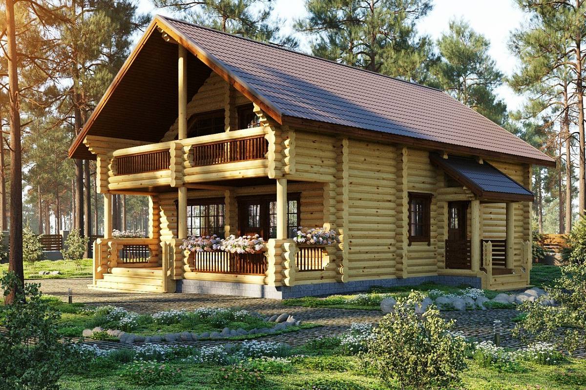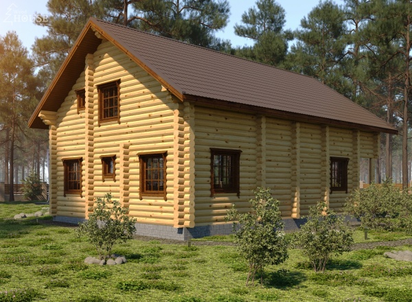 Проект дома выполнен из оцилиндрованного бревна 22 диаметра, поэтому подойдет для постоянного проживания. Архитектура классическая для таких проектов – двускатная кровля, мансардный этаж, терраса и балкон украшают южный фасад.