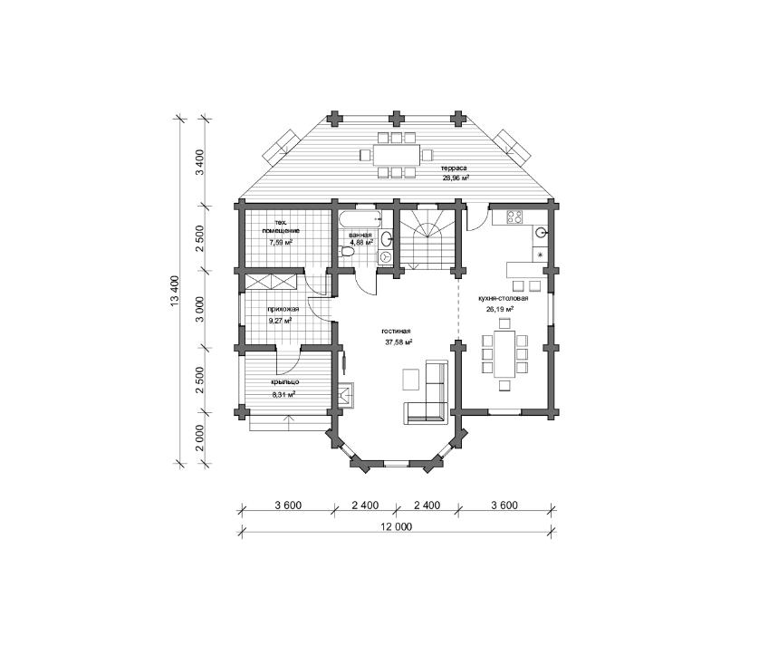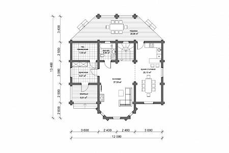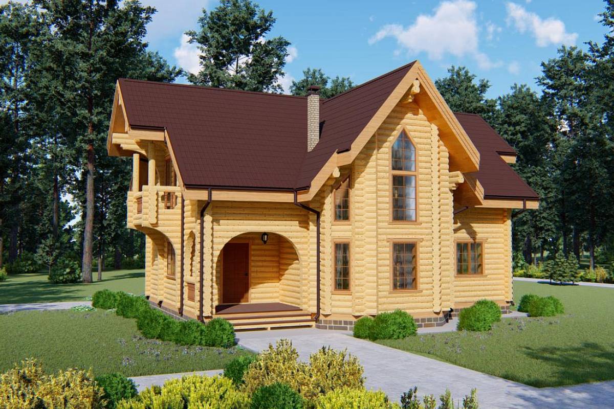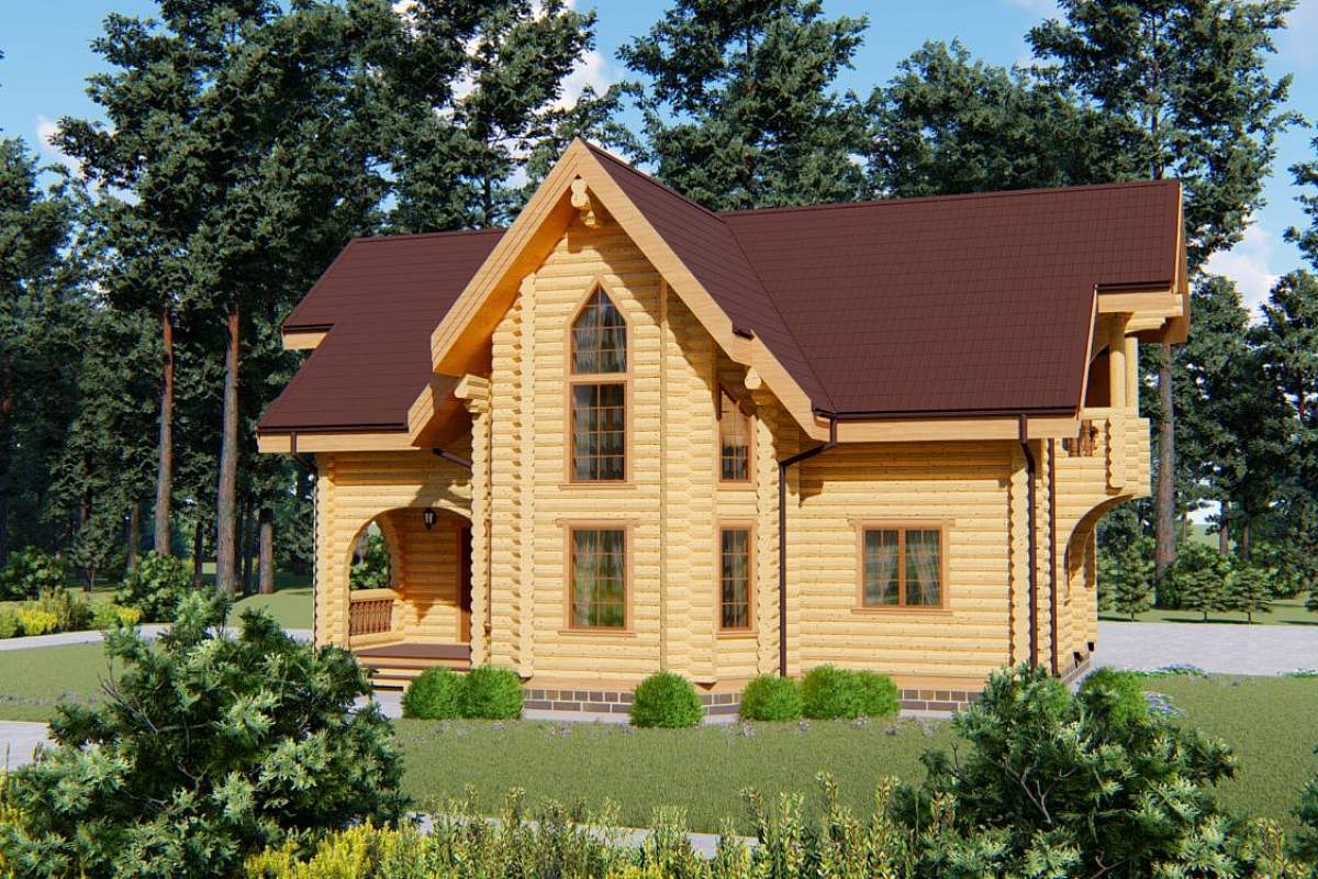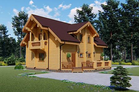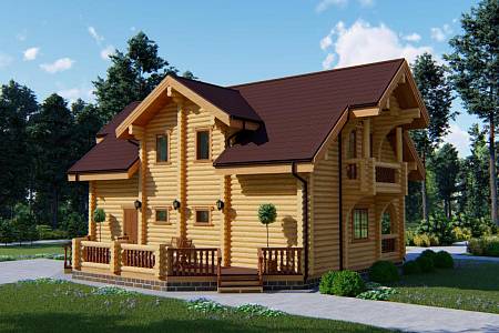 Данный проект деревянного дома внешним видом напоминает сказочное жилище, за счет заостренной крыши и эркера с панорамными окнами. Дом можно использовать как для постоянного проживания, так и в виде дома выходного дня.