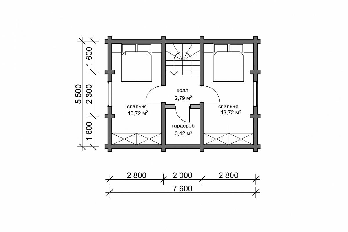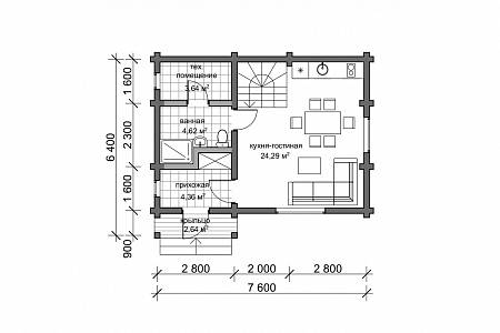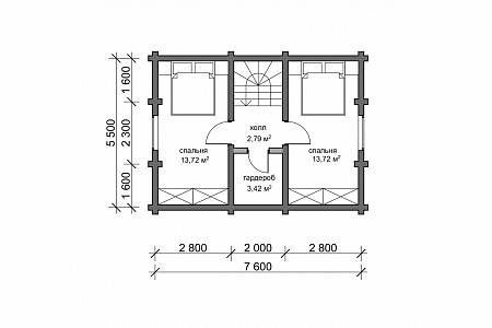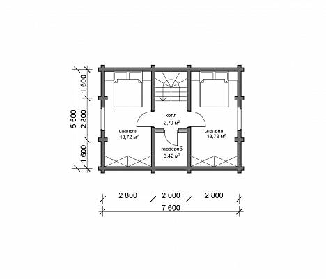 Перед домом оборудовано небольшое крыльцо под единой крышей. В прихожей площадь позволит поставить шкаф-купе, зеркало, вешалку, обувницу. Из прихожей попадаем в объединенное пространство кухни-гостиной. Здесь размещается кухонный гарнитур с плитой, холодильником, шкафчиками для посуды и хранения продуктов. Площадь позволяет разместить обеденный стол на 6 персон. Конечно, остается место для мягкой зоны, можно поставить прямой или угловой диван. На первом этаже спроектирован санузел с душевой кабиной. Есть техническое помещение, где размещаются приборы отопления, водонагреватель, можно поставить стиральную машинку. Второй этаж представлен двумя спальнями, на против лестницы размещена кладовая-гардеробная.