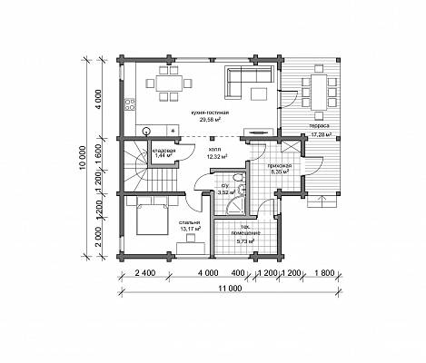 Фасады дома украшают панорамные окна с двух сторон и терраса для летнего времяпрепровождения всей семьи. Прихожая выполняет роль теплового тамбура, здесь разместится шкаф-купе для хранения верхней одежды. Здесь же вход в техническое помещение. Из холла можно попасть в спальню, санузел, по лестнице на второй этаж и небольшую кладовую, организованную под лестницей. Кухня объединена с гостиной, это пространство позволяет собраться всей семьей для отдыха. На втором этаже запроектированы просторный санузел и четыре спальни, поэтому этот дом подойдет семье из 6-7 человек.