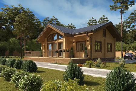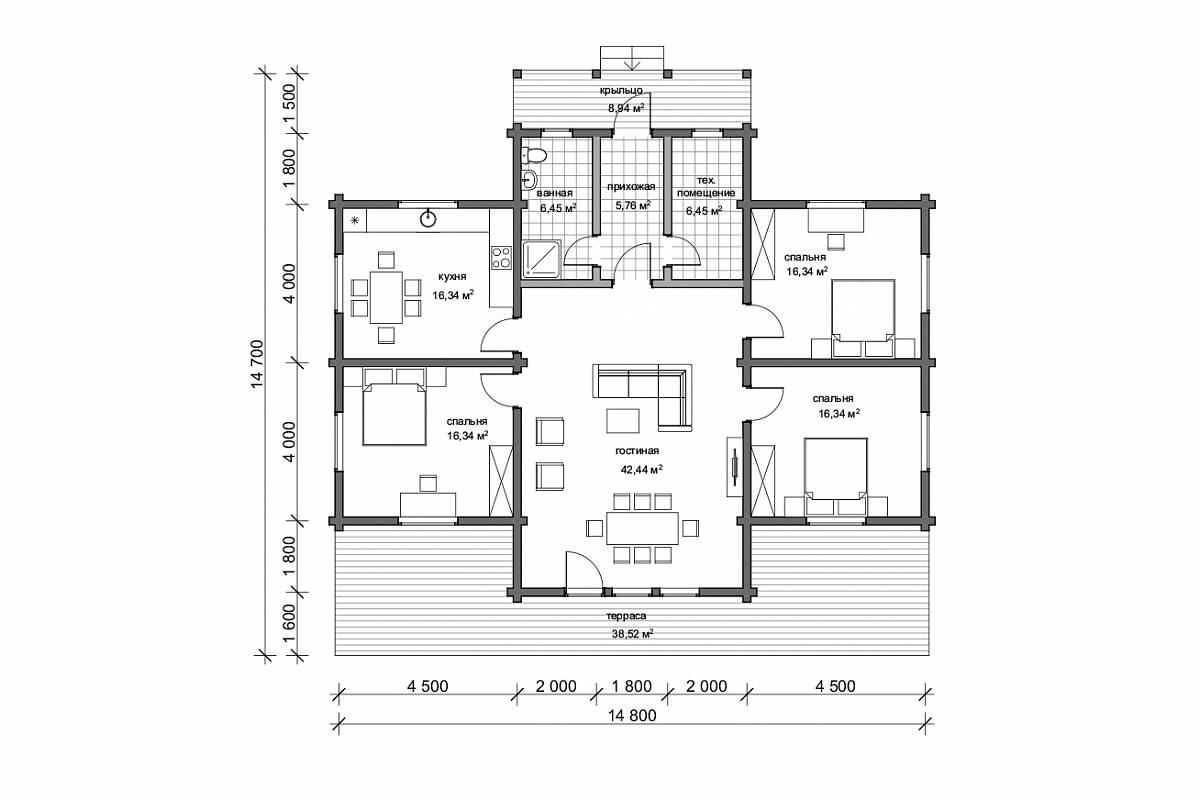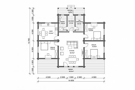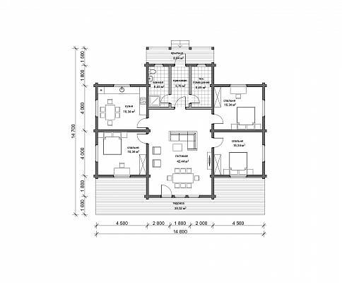 План дома разработан так, чтобы окна двух спален и гостиной выходили на южную сторону, а все технические помещения размещались по северной стороне. Такое решение дает максимальное освещение в жилых пространствах, в гостиной этот эффект дополнительно усилен вторым светом.