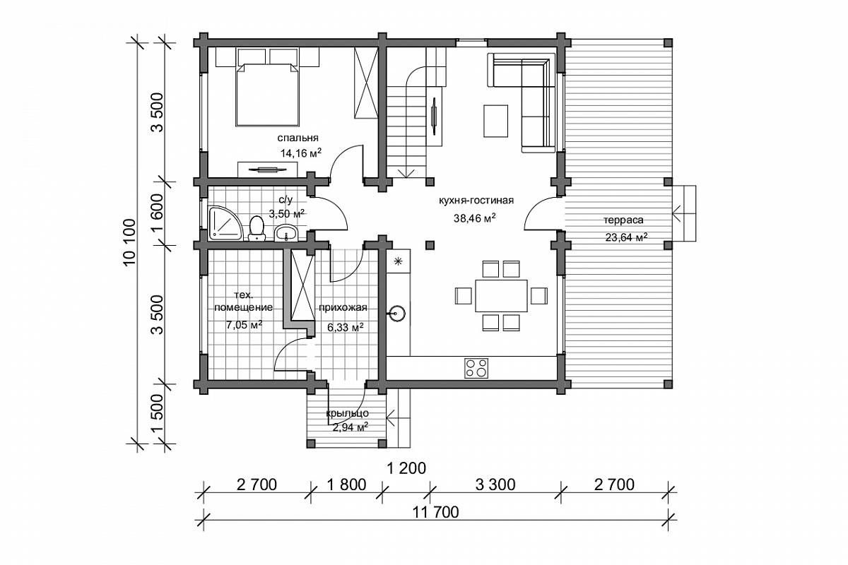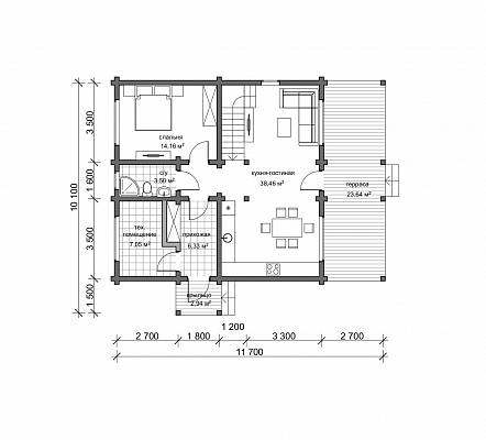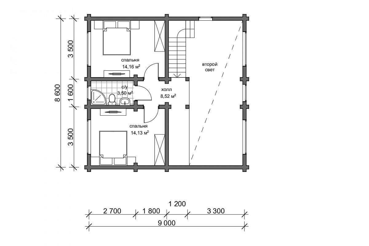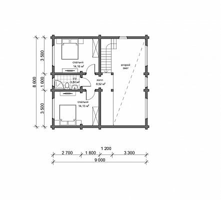 Габариты дома 8,6х11,7 м, в доме есть все необходимые помещения для комфортного проживания: тепловой тамбур, котельная, вместительный гардероб, совмещенный санузел. Также на первом этаже располагается спальня 14 м.кв. и общее пространство кухни- гостиной 33 м.кв. В гостиной запроектирован второй свет, это визуально расширяет пространство, обеспечивает хорошую освещенность. На второй этаж ведет лестница с забежными ступенями, здесь организованы две спальни по 14 м.кв. и санузел.
