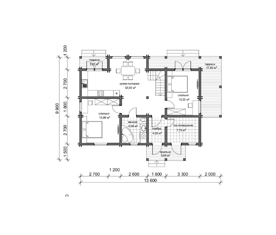 В доме запроектированы небольшой выход в сад из кухни и большая терраса, которая позволит разместиться всей семье для летних посиделок и совместного отдыха.