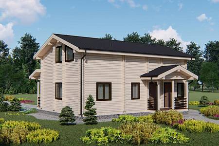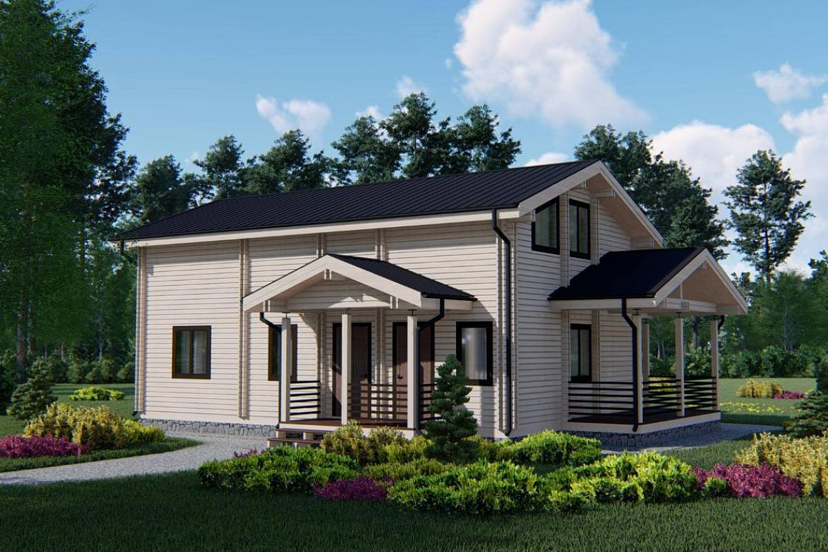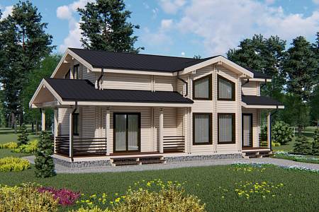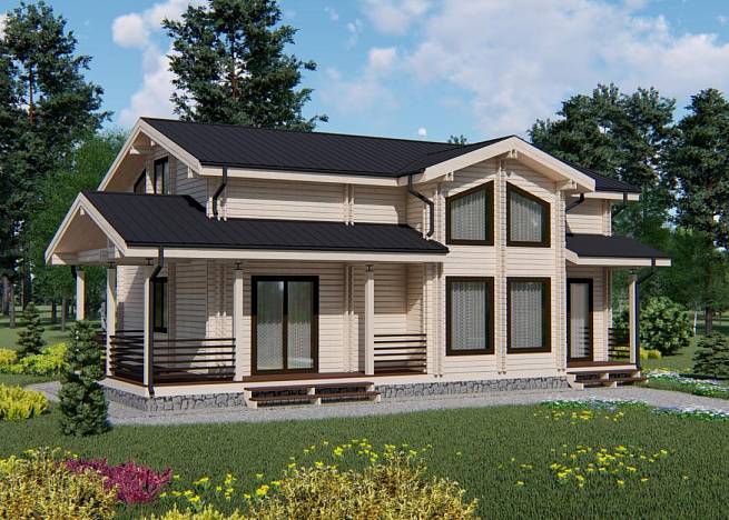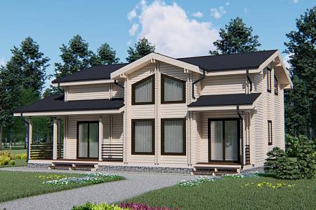 Проект дома с общей площадью 161 м.кв. подойдет семье с 5-6 людьми в составе, так как здесь запроектировано 5 жилых комнат. Дом выполнен с применением современных тенденций в дизайне экстерьера, при этом учитываются классические для деревянного дома скандинавские мотивы.