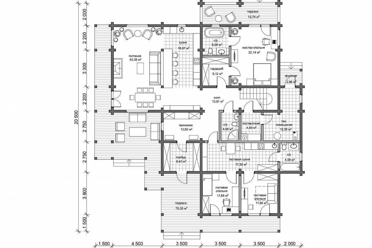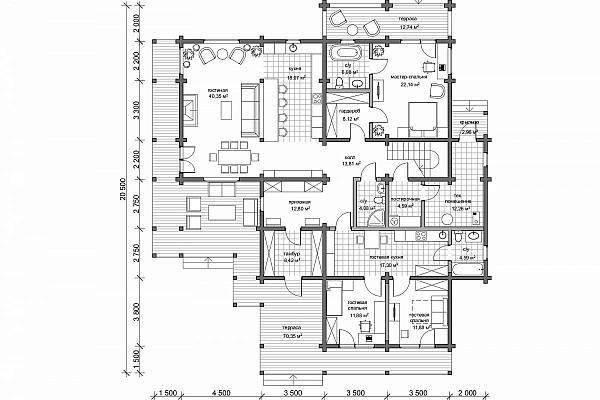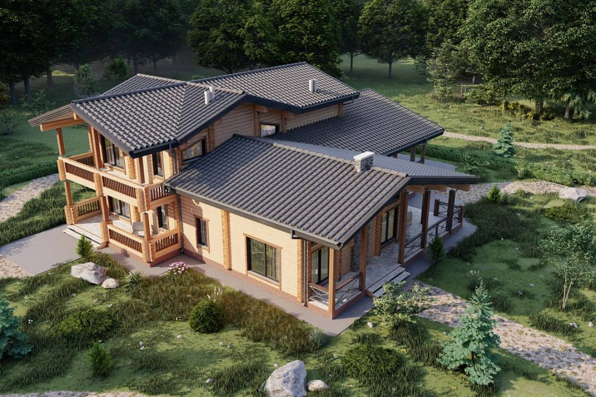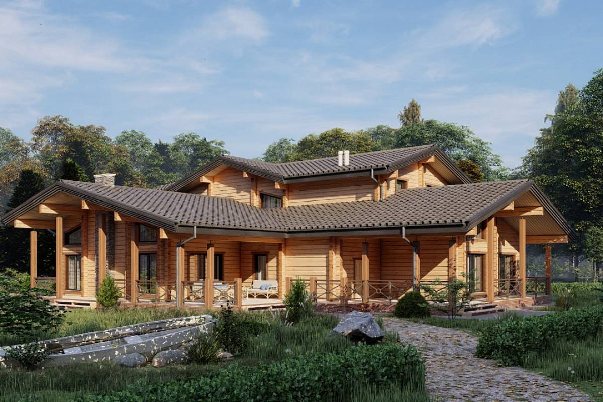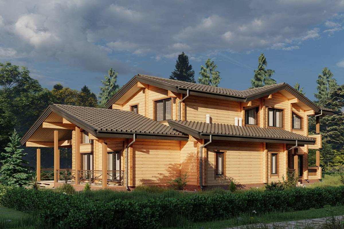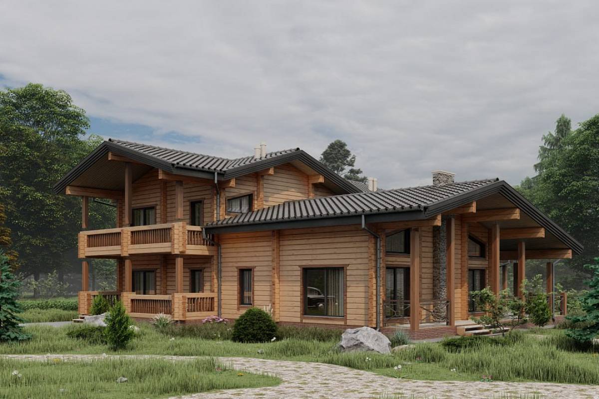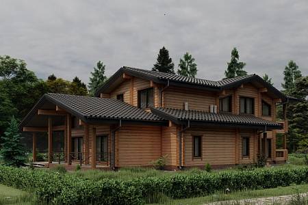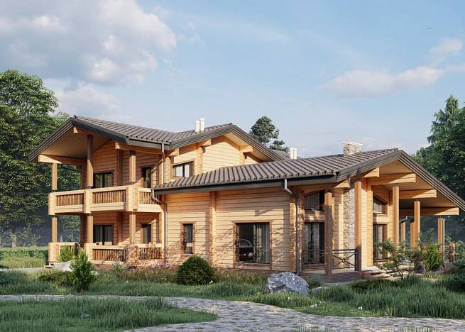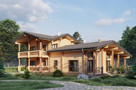 Проект деревянного дома 388 кв. м., разработан как комфортный, оснащенный функциями, статусный особняк. Здесь подчеркнуты статус, достоинство хозяина дома, поэтому был выбран экологичный и современный материал премиум-сегмента – клееный брус большого сечения. Брус специально заготавливают на производстве, нарезают под проект, соблюдая точность деталей, нарезки чаш, отчего дом получается теплым, комфортным. В этом доме хотелось подчеркнуть натуральные текстуры – дерево, камень – они использованы в наружной отделке, и в интерьере.