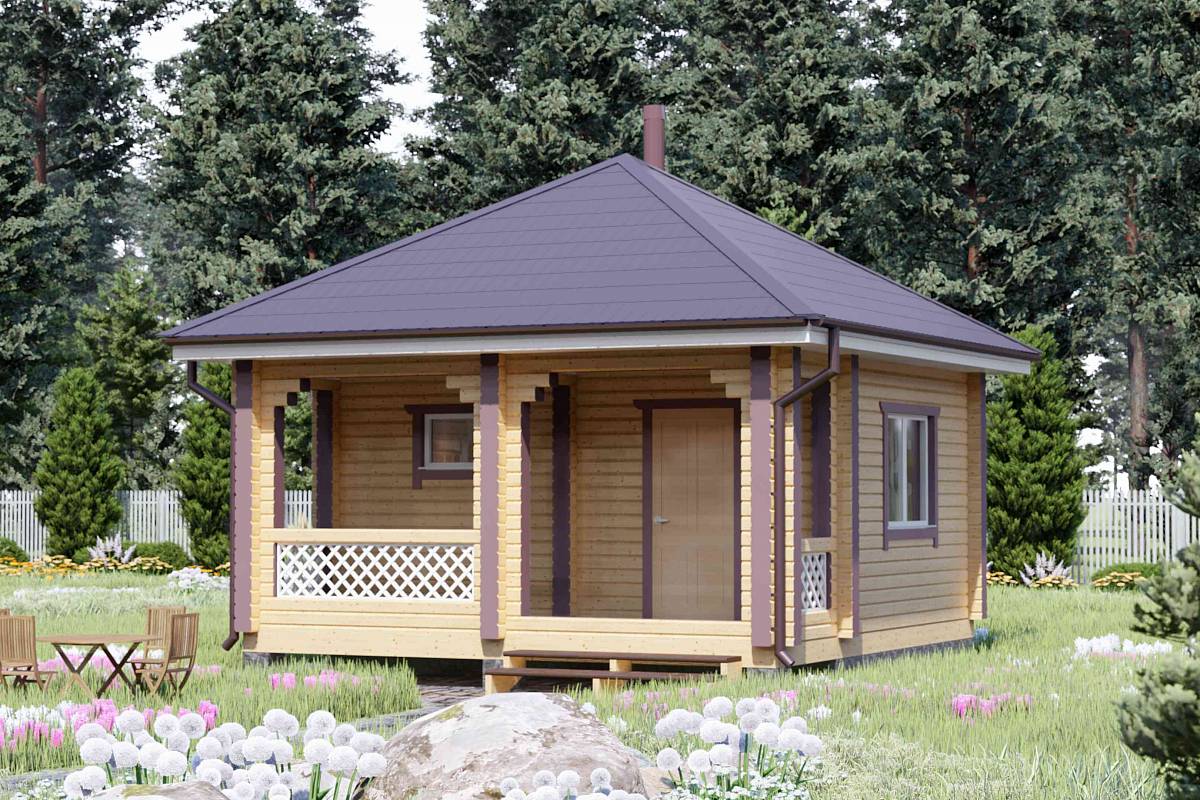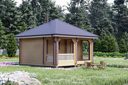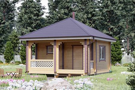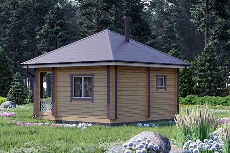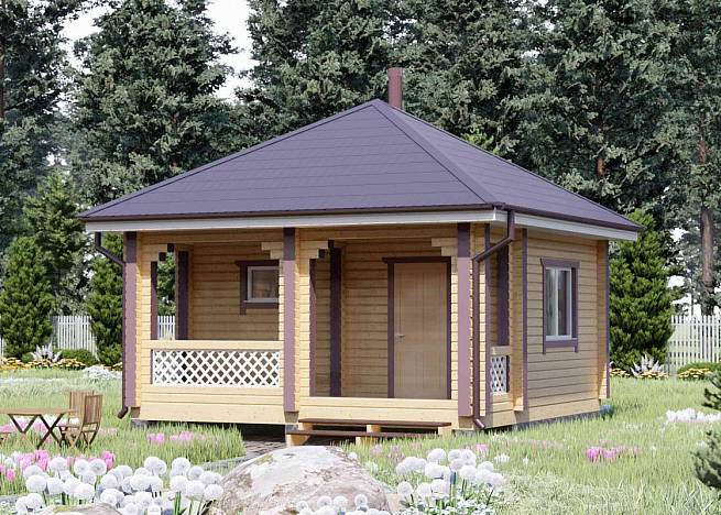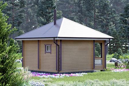 Эта уютная баня из клееного бруса - идеальное место для отдыха и восстановления сил. Экстерьер бани выполнен в традиционном стиле. Она оборудована ажурной террасой, вход устроен через тепловой тамбур. Основное пространство бани – это комната отдыха, где можно поставить обеденный стол, а также моечная с душем и обливным ведром. Сердцем строения является парное помещение, топка печи выполняется из комнаты отдыха.