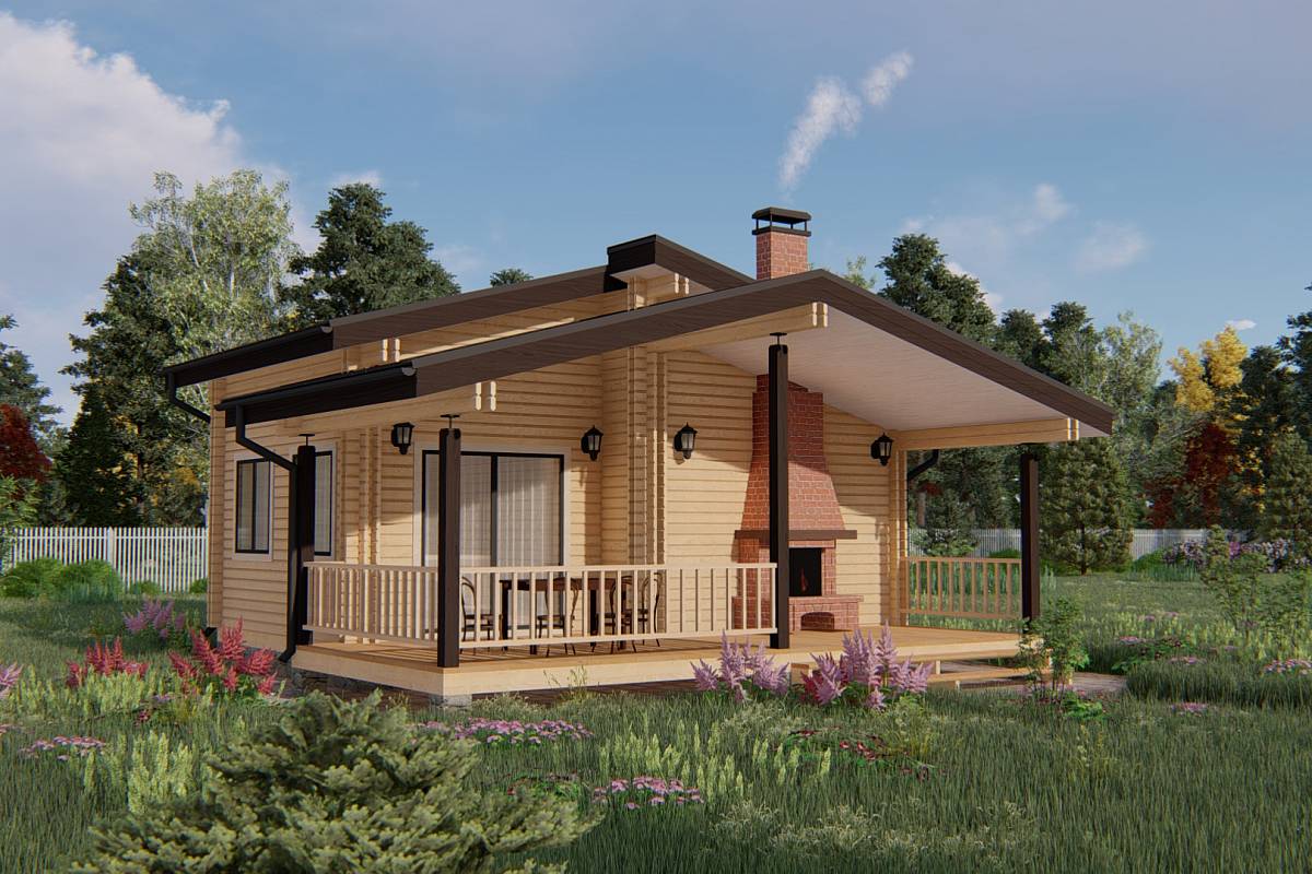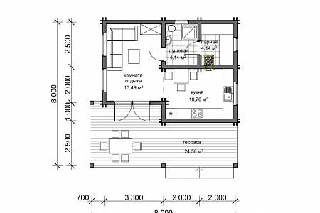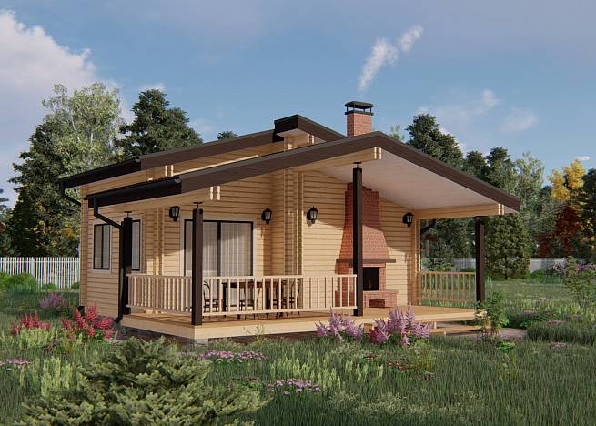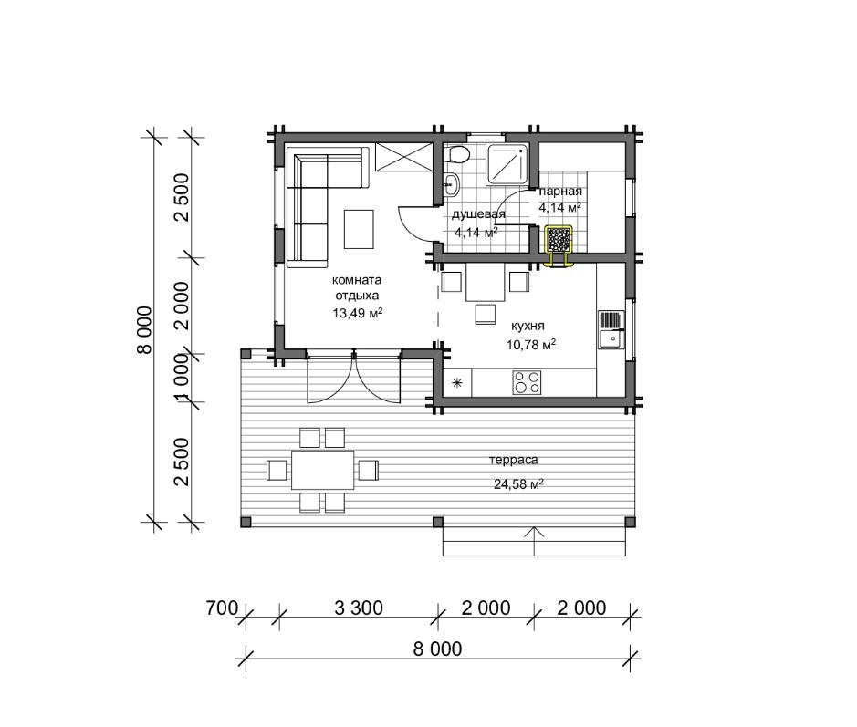 Внутреннее пространство бани разделено функционально на две части – это банная зона и зона отдыха. Зона отдыха разделена также на две части – кухня, где удобно разместить кухонный гарнитур, обеденный стол для приема большого количества гостей; и комната отдыха, где предполагается размещение углового дивана, зона просмотра тв, здесь же можно оставить гостей на ночь. Банная часть представлена душевой и парной. В парной предполагается размещение широкого полога с двумя ярусами. Терраса перед домом может выполнять роль летней кухни, здесь можно установить печь-барбекю с обеденной зоной, поставить садовую мебель, качель, повесить кресло или гамак.