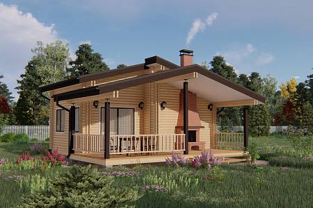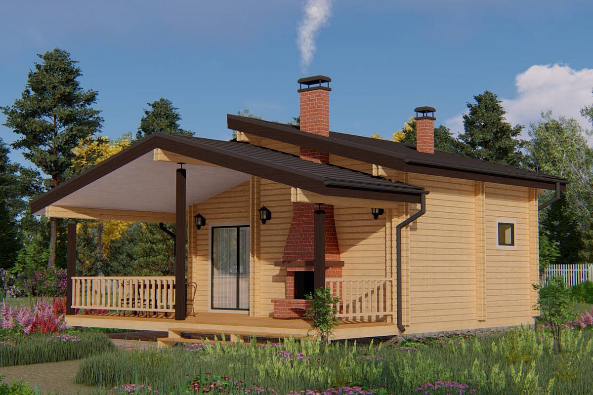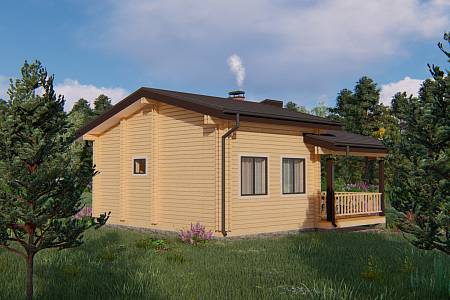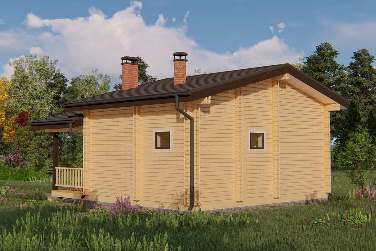 Проект бани с ярусной кровлей. Имеет общие размеры 8х8 м. Так как баня имеет увеличенную площадь ее можно использовать как гостевой дом. Фасады бани выглядят необычно и оригинально из-за двухъярусной несимметричной кровли. Крыша выполнена в два объема – один над баней и второй над террасой. В бане устроены широкие окна для максимального попадания внутрь естественного света.
