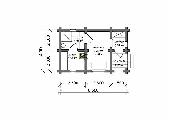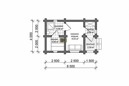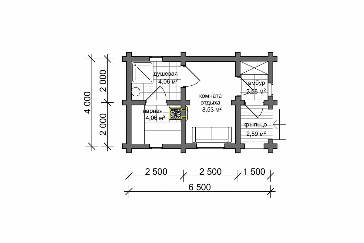 Конструкция бани подразумевает следующие помещения – крыльцо, тамбур, комнату отдыха и банную часть с душевой и парной. На крыльце можно хранить небольшой запас дров, чтобы подбросить их в печь в случае необходимости. Тамбур можно использовать как прихожую в доме – оставить здесь верхнюю одежду и обувь, оборудовать полку с тапочками.