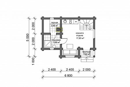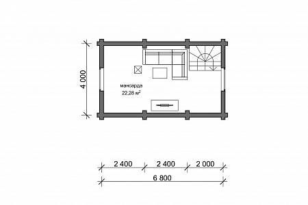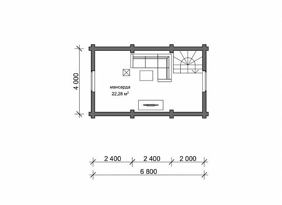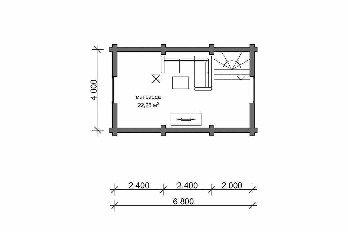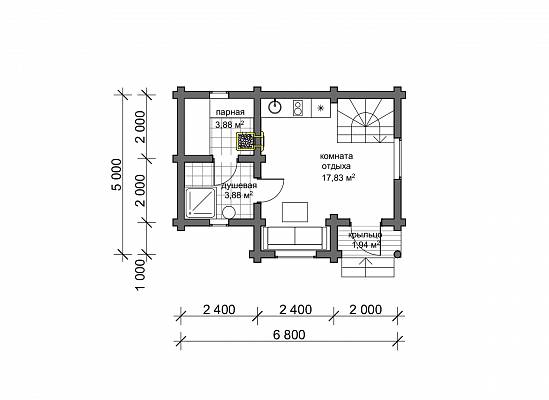 Планировочное решение разбито на две зоны – это банная часть и пространство для отдыха. Банная зона представлена классической душевой и парной. В душевой кроме душа, обливного ведра хватит места для организации санузла. Парная выполнена с г-образным двухъярусным пологом, топка банной печи происходит из комнаты отдыха. Комната отдыха просторная и функциональная, здесь устроен шкаф для верхней одежды, кухонный гарнитур, диванная зона с обеденным столом. На второй этаж ведет лестница с забежными ступенями, она не занимает много площади помещения. Второй этаж мансардный, выполнен в свободной планировке, по желанию можно отгородить отдельную спальню или использовать всю площадь для отдыха.