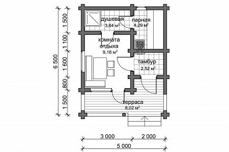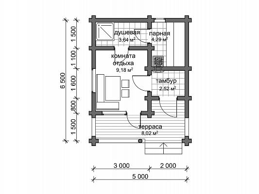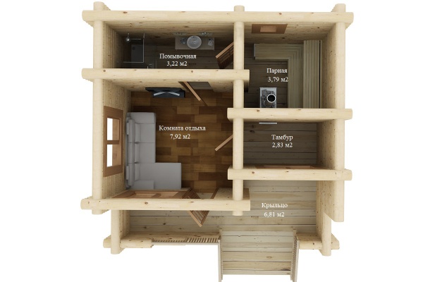 Вход в баню осуществляется через тепловой тамбур, здесь предусмотрен шкаф для верхней одежды и обуви. Также топка банной печи выходит в тамбур, что предотвращает разнос грязи и опилок от дров, а также не мешает отдыхающим подкидывать дрова в печь. В комнате отдыха можно поставить угловой диван и стол для чаепития. Банная зона представлена помывочным отделением, где размещается душ, обливное ведро. В парной предусмотрено устройство г-образного полога с двумя ярусами.