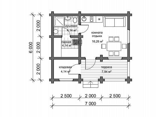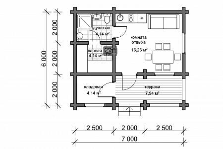 Банная часть представлена комнатой отдыха, душевой и парной. В комнате отдыха можно разместить небольшой кухонный уголок, поставить диван и стол. В душевой можно организовать выделенный санузел, поставить душ и обливное ведро. Сердце бани – парная, здесь запроектирован г-образный двухярусный полог, топка печи выходит в комнату отдыха, образуя там портал камина. Терраса может послужить дополнительным местом отдыха в летний период времени. С террасы можно попасть в кладовое помещение, его можно использовать как дровник или для хранения садового инвентаря.