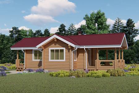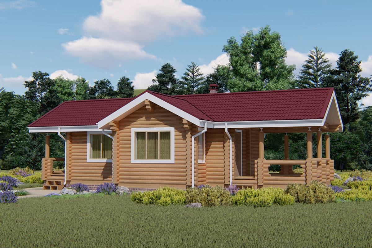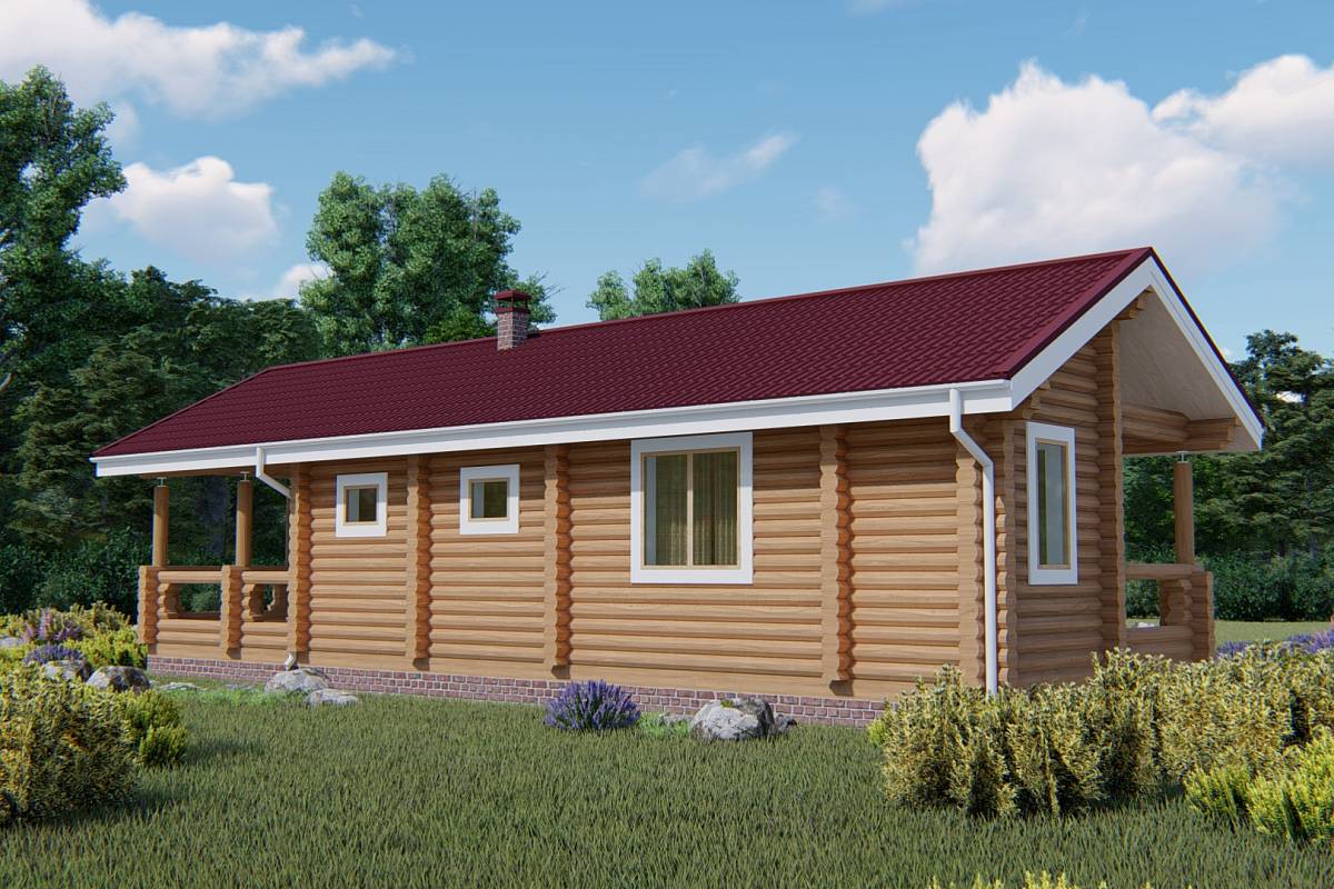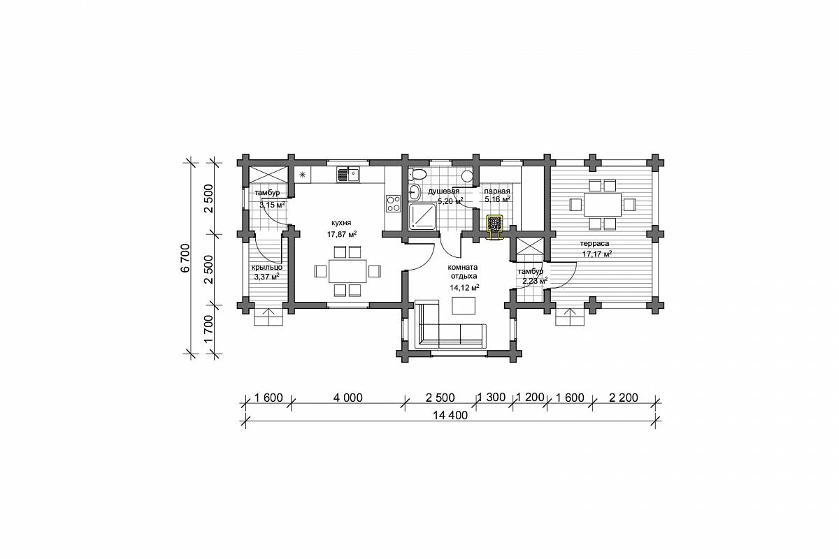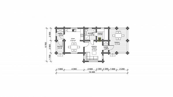 Проект бани с летней кухней и большой площадью банного пространства. Баня выполнена из оцилиндрованного бревна, имеет общие размеры 6,7х14,40 м, подойдет к размещению на участке вдоль забора, с помощью такой бани можно визуально отгородится от соседей.