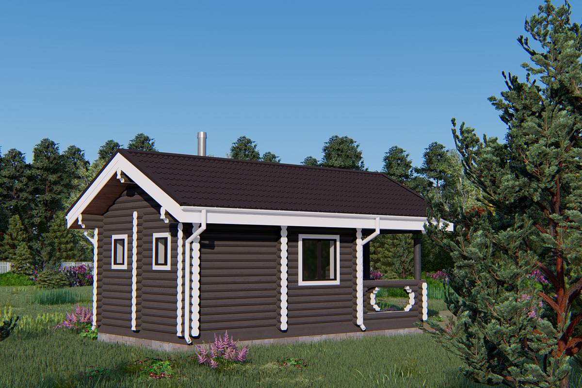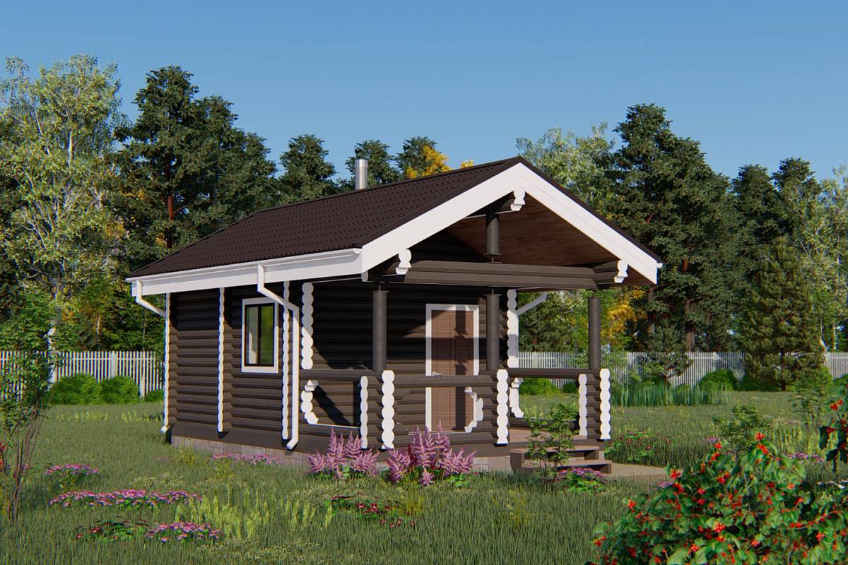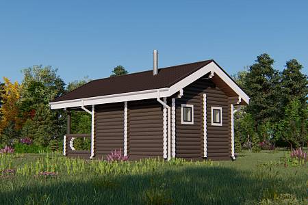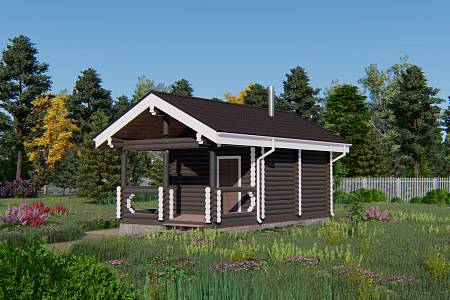 Классический проект деревянной бани выполнен из оцилиндрованного бревна. Функционально план бани разделен на три зоны – это крытая терраса, комната отдыха и банная часть.
