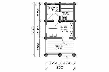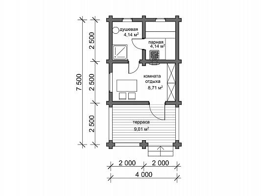 Вход в баню организован с террасы, здесь в летнее время можно разместить садовую мебель, шезлонги, качели – для принятия солнечных ванн или чаепития. Также на террасу вместится деревянная купель на 2-3 человек. В комнате отдыха достаточно пространства для размещения шкафов для одежды, обеденного стола и лавок для отдыха. Банная часть представлена душевой и парной. Банная печь размещена таким образом, что ее топка выходит в комнату отдыха, образуя там портал камина.