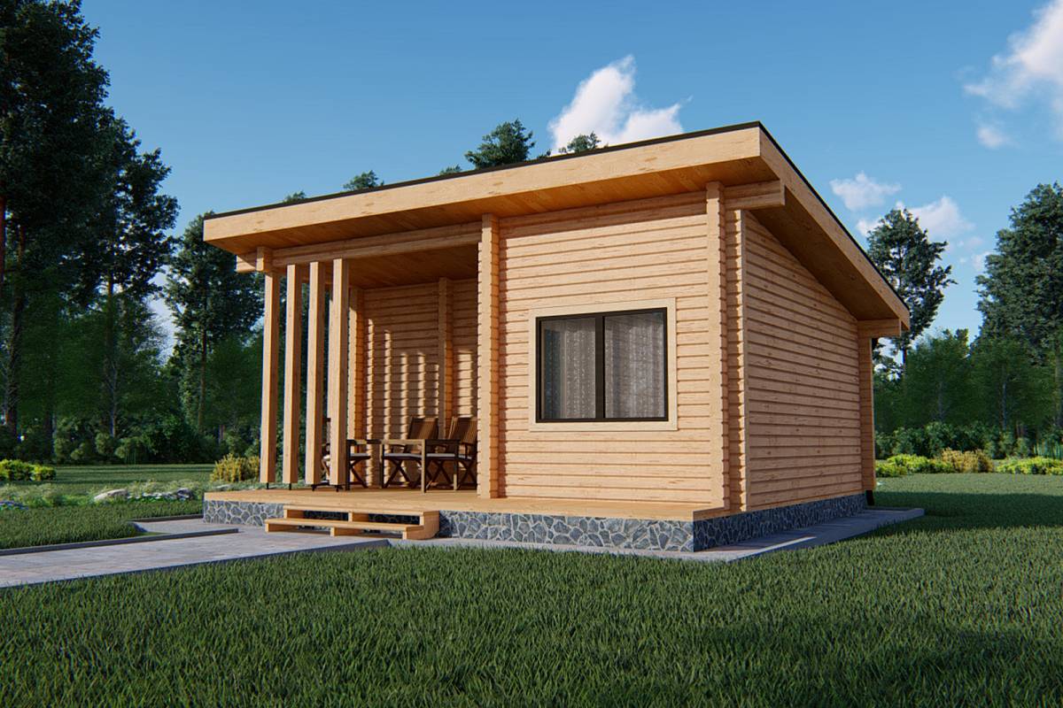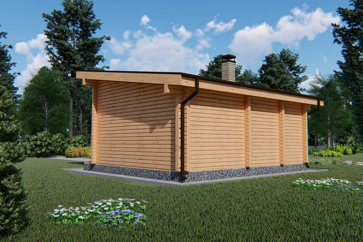 Баня из профилированного бруса выполнена в стильном дизайне с односкатной кровлей, открытой террасой и широким окном в комнате отдыха. Баня содержит все необходимые помещения для комфортного парения и отдыха. Вход в баню организован с террасы, в летнее время здесь можно поставить обеденный стол, садовую мебель. Далее попадаем в просторную комнату отдыха, здесь можно организовать вешалки для верхней одежды, поставить небольшой кухонный гарнитур и еще хватит места для дивана и стола для чаепития. Банная зона представлена тремя помещениями: раздевалкой, душевой и парной.