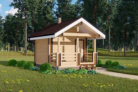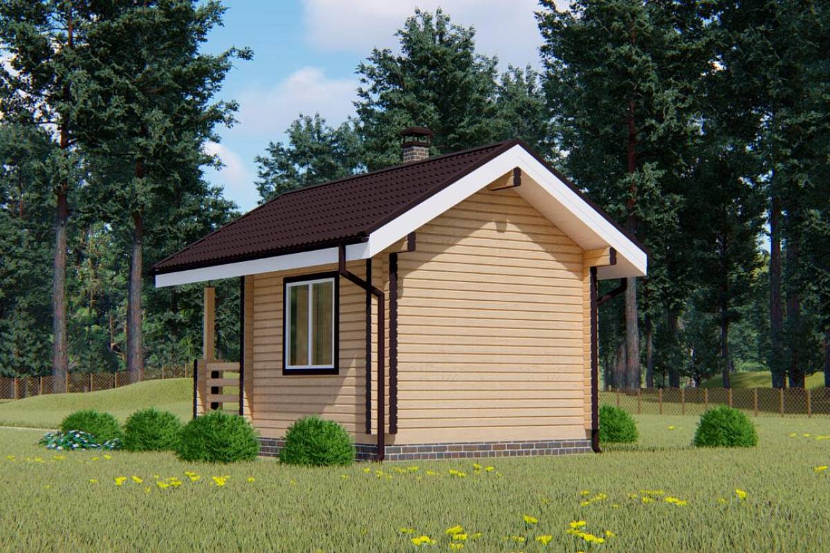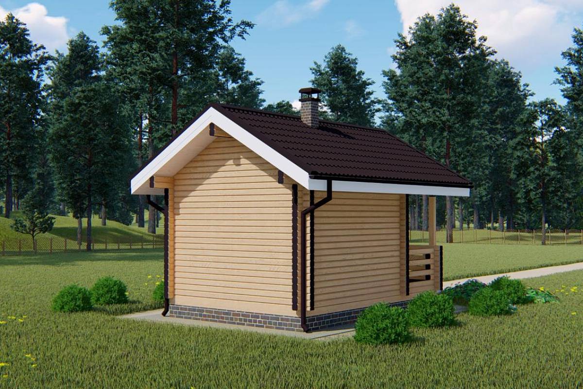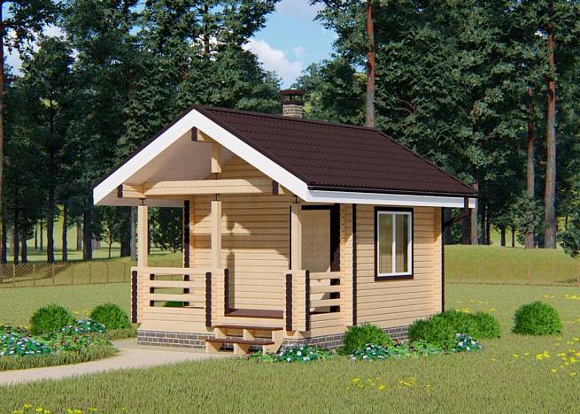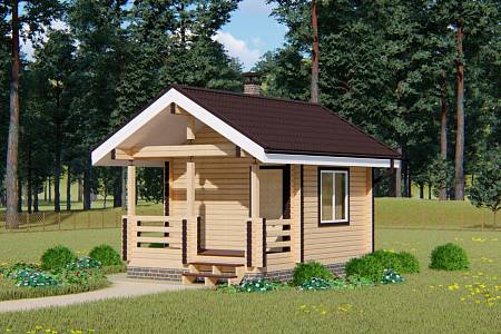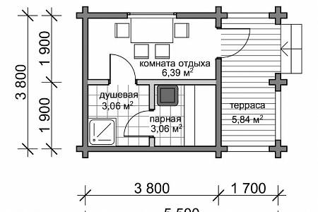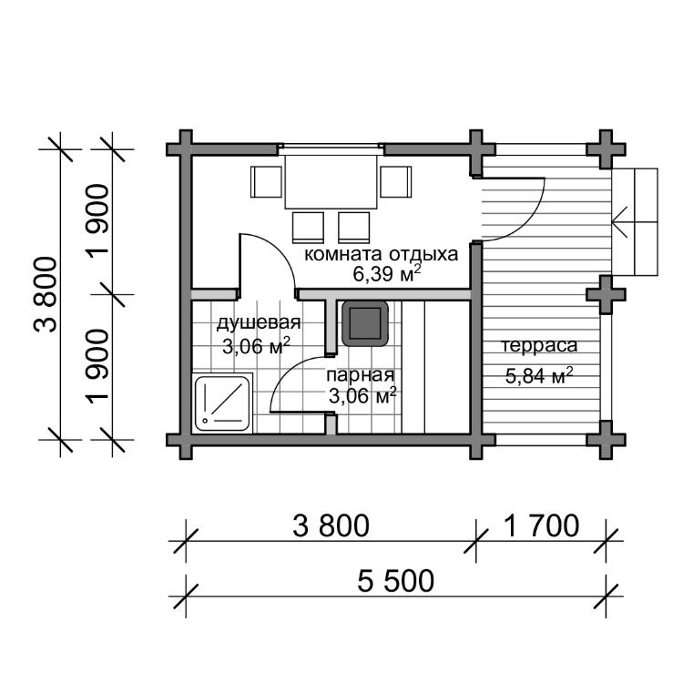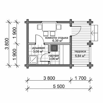 Проект бани из профилированного бруса с общей площадью 18 м.кв. и габаритами 3,8х5,5 м. Лицевой фасад бани украшает терраса, на которой можно разместить кресла для отдыха или поставить стол для чаепития на свежем воздухе. Внутренее пространство делится на предбанник, моечное отделение и парную, перегородки между этими отделениями выполняются по месту и обшиваются имитацией бруса. Банная печь размещена таким образом, что ее топка выходит в предбанник – это удобно, ведь грязь и щепки от дров не разносятся по всем помещениям, а подбрасывать дрова можно не беспокоя отдыхающих.