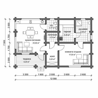 Вход в баню организован через теплый распределительный тамбур, где можно снять верхнюю одежду и обувь. Из тамбура можно попасть в банную часть, топочную и кухню-гостиную. Гостиная имеет площадь 24 м.кв, здесь устроен кухонный гарнитур, обеденный стол, диванная зона с просмотром тв, площади достаточно, чтобы здесь оставить гостей ночевать. В бане устроен отдельный санузел и топочное помещение, что удобно, не разносится грязь и опилки от дров. Банная часть представлена комнатой отдыха, моечной и парилкой. В парной устроен угловой двухъярусный полог для одновременного парения в четыре руки, в моечной установлены душ, обливное ведро, можно поставить небольшую купель или кедровую бочку.