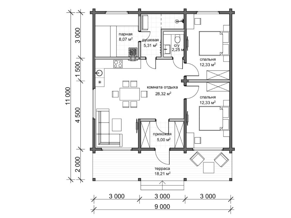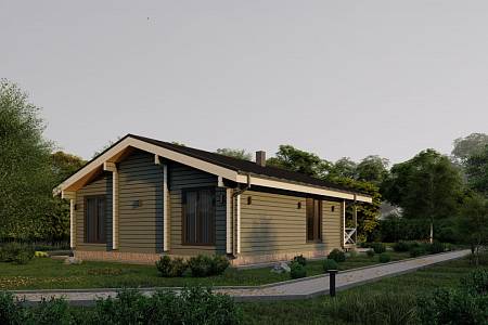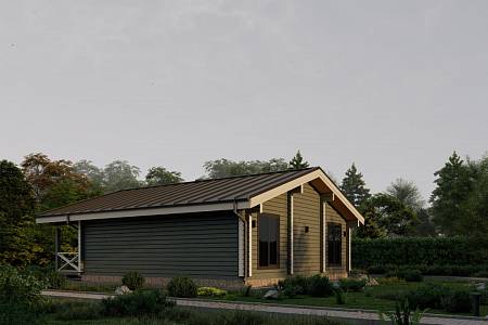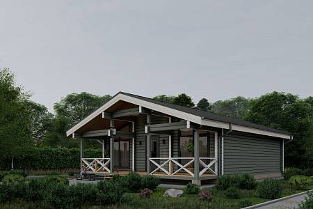Дом-баня – функциональный и удобный формат жилья, который подходит как для сезонного, так и постоянного проживания. В проекте «Лаймы» парная дополнена моечной, рядом расположен санузел. Две спальни имеют оптимальную площадь – по 12 кв.м. Планировка лишена коридоров, таким образом рационально используется всё пространство дома. В прихожей достаточно места, чтоб расположить два вместительных шкафа. Терраса имеет внушительный размер, при этом уютна и красива, за счет четкой геометрии горизонтальных потолочных балок и ограждения контрастного цвета. Преимущества: Хит спроса Большая комната отдыха Две спальни оптимальной площади Вместительная прихожая-тамбур