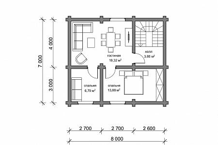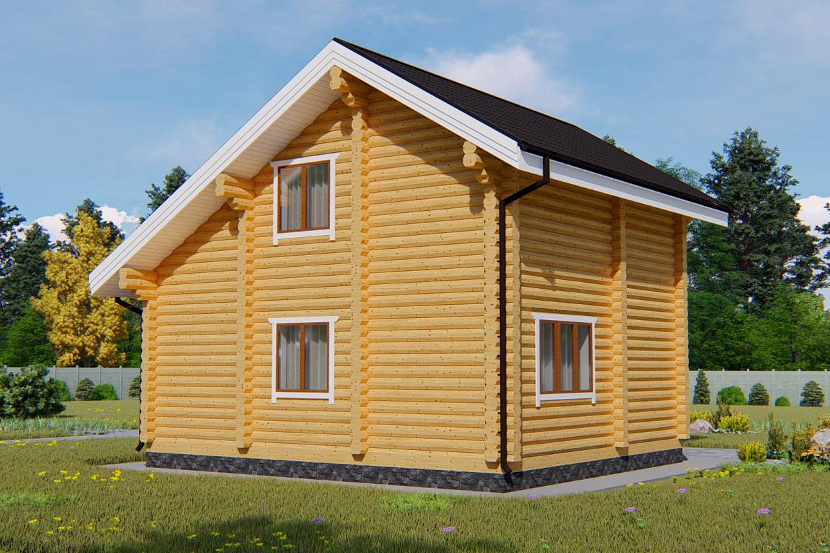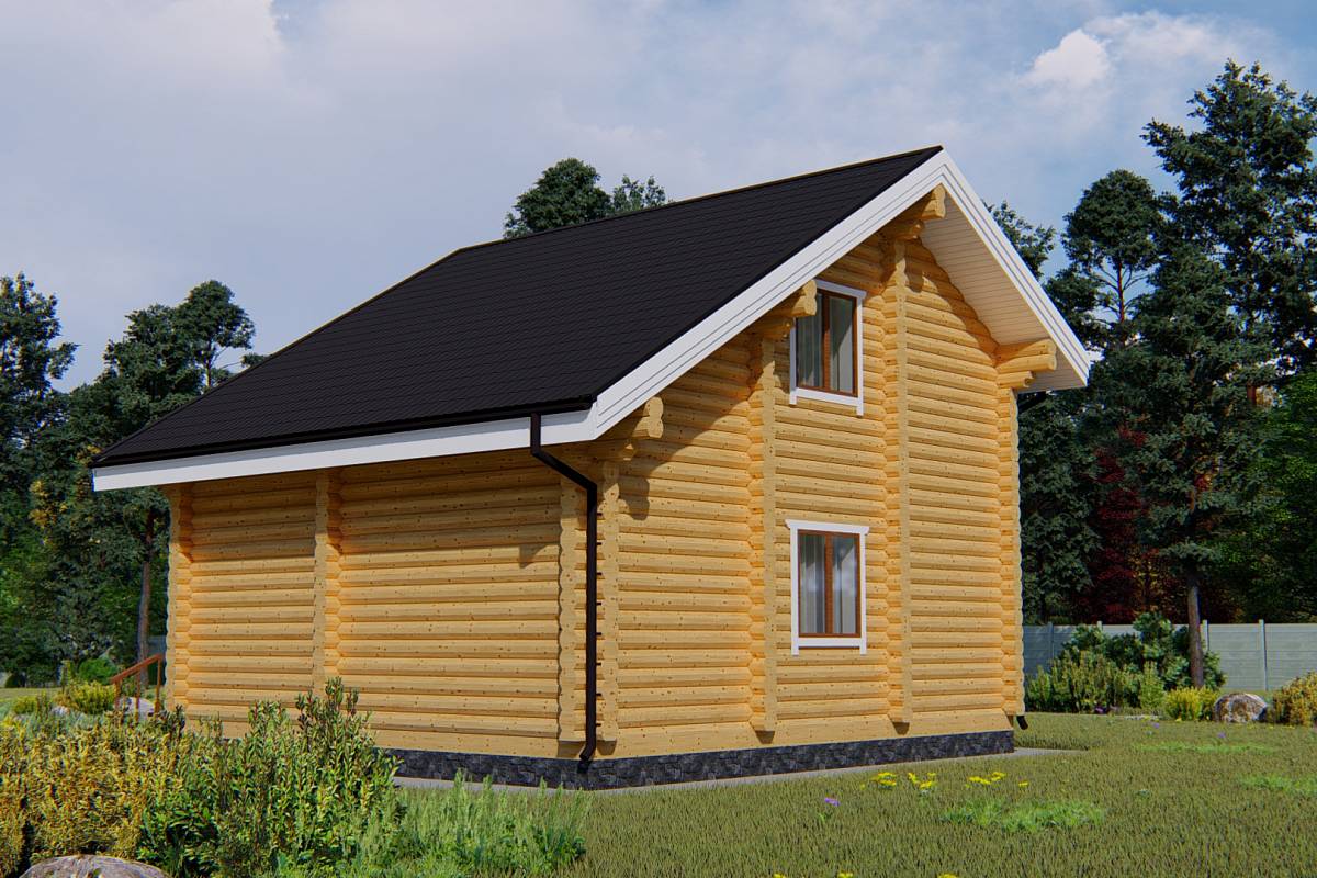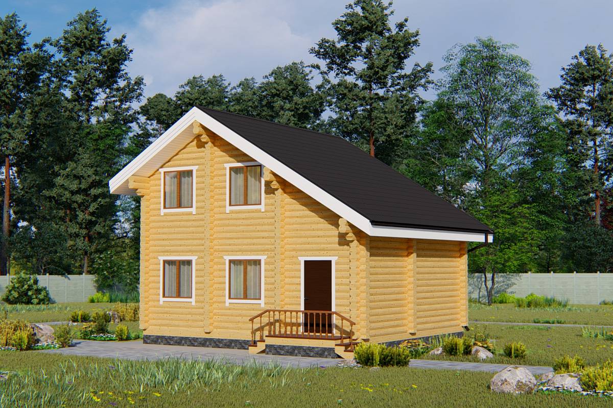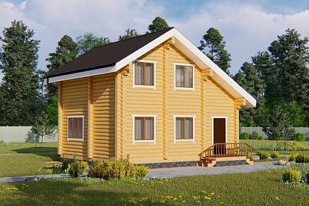 Проект дачного дома выполнен из оцилиндрованного бревна. Подойдет даже для садовых участков от 4 соток, так как имеет небольшие габариты.