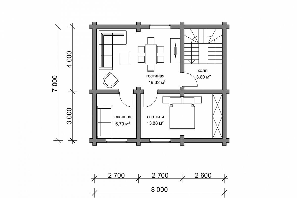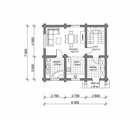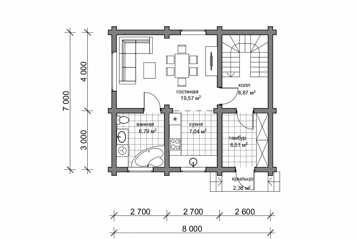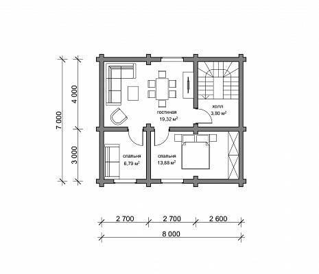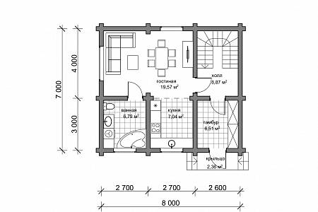 Планировочное решение простое – на первом этаже располагаются прихожая, где можно разместить шкаф, обувницу, здесь же запроектирован подъем на 2 этаж. Далее мы попадаем в гостиную, и из нее ведет две двери – в кухню и санузел.