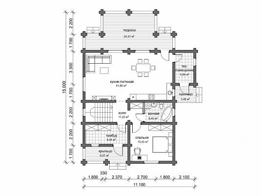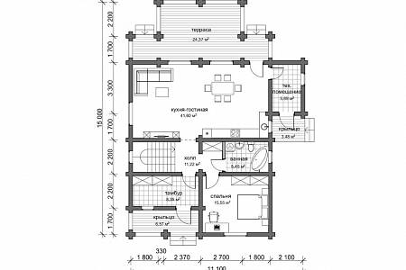 Планировочное решение лаконичное, при этом грамотно выделены функциональные зоны. Вход в дом организован с крыльца, через тепловой тамбур. Холл является распределительным помещением, из него попадаем в гостевую спальню, санузел, по лестнице на второй этаж и в гостиную. Общее пространство кухни-гостиной самое большое, здесь поместятся кухонный гарнитур, обеденный стол, мягкая диванная зона. Из кухни сделан выход на летнюю террасу.