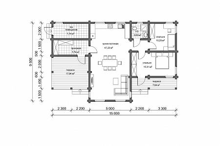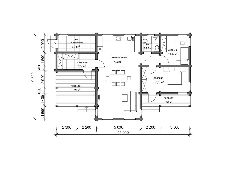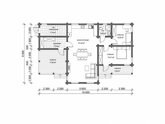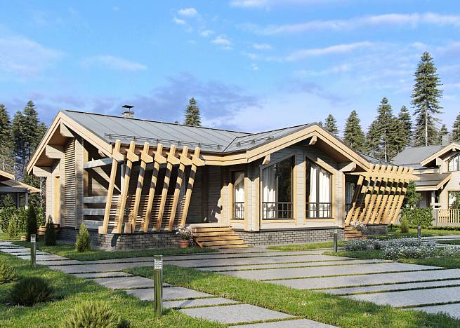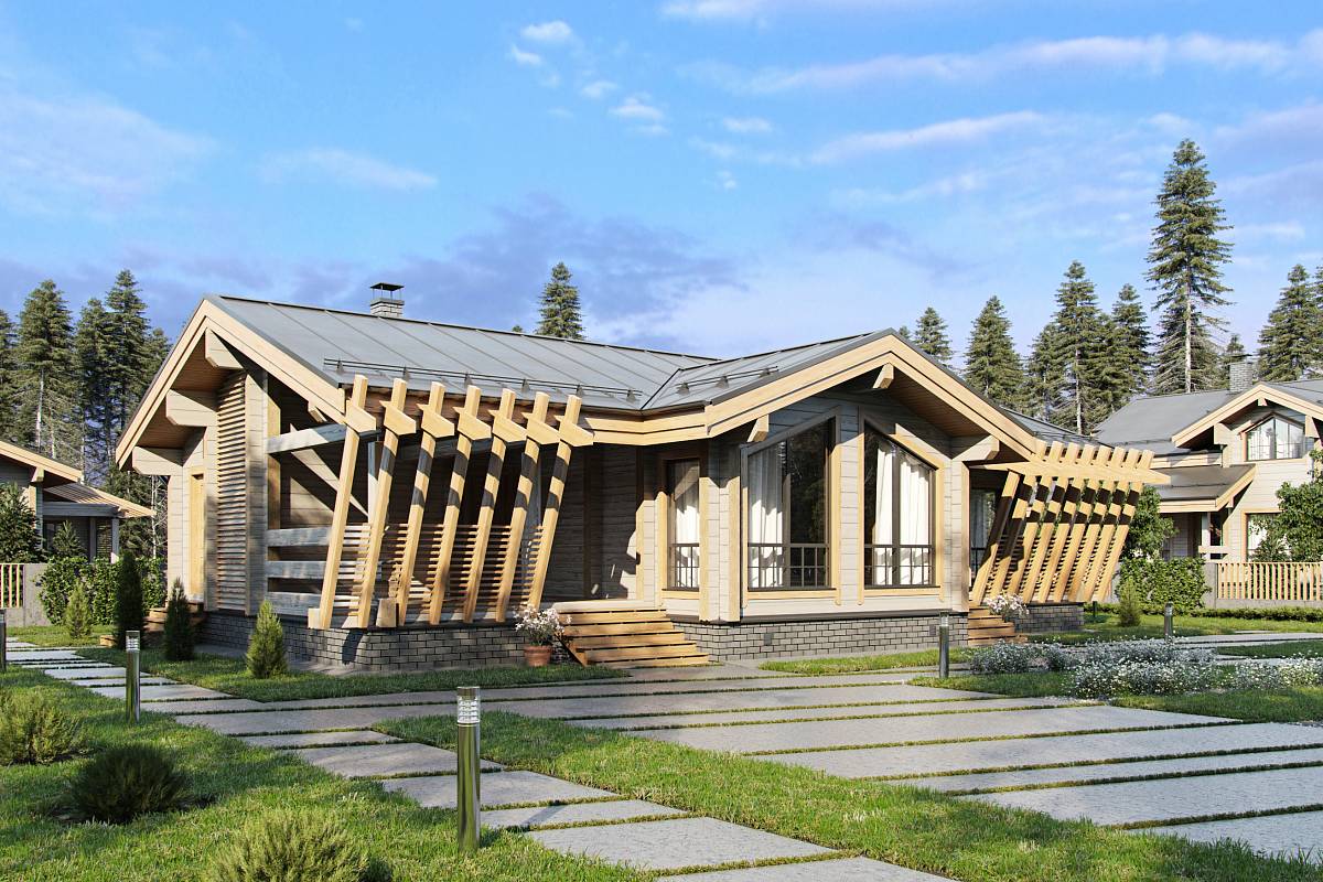 Проект одноэтажного дома выполнен из профилированного бруса, подходит как для сезонного, так и для постоянного проживания. Имеет габариты 9,5х15,0 м, разместится на участке от 8 соток. Дом на участке лучше всего располагать таким образом, чтобы окна гостиной смотрели на южную сторону, так в дом будет попадать максимум естественного света.