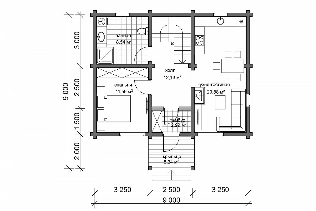 Вход в дом организован с крыльца, которое защитит хозяина от осадков и ветра. Внутреннее пространство в доме спроектировано с учетом конструктивного решения. В большом холле размещается лестница на второй этаж, здесь можно установить прихожую, обувницу, шкаф-купе. Из холла попадаем в жилую комнату, санузел, который выполняет функции постирочной, здесь же размещается бойлер, электрический котел отопления. Пространство кухни объединено с гостиной. Здесь размещаются кухонный гарнитур, обеденная зона и диван для отдыха и приема гостей.