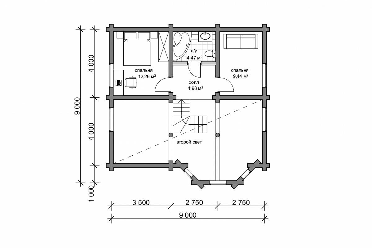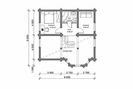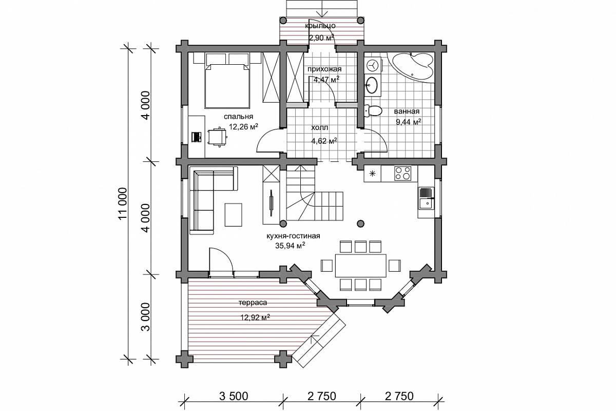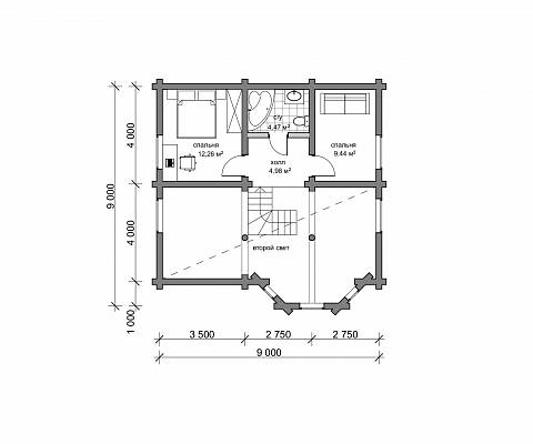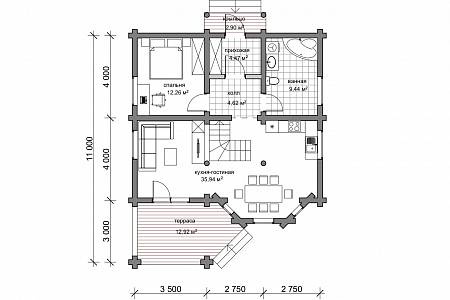 На первом этаже размещается прихожая, санузел, комната, совмещенная кухня-гостиная. Санузел здесь достаточной площади для размещения всего инженерного оборудования, если на участке нет подключения газоснабжения и есть перебои с электричеством, то в этом случае устанавливается твердотопливный котел. Над помещением гостиной оформлен второй свет. На втором этаже дополнительный санузел и три спальни.
