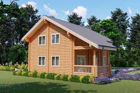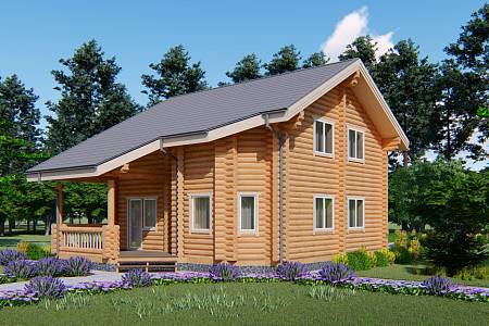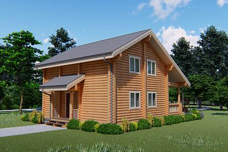 Проект дачного дома из оцилиндрованного бревна, при диаметре бревна 22 см пригоден для постоянного проживания. Фасады дома лаконичные, при этом изящества проекту добавляет выступающий эркер и терраса.