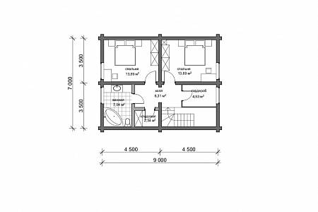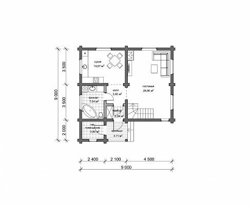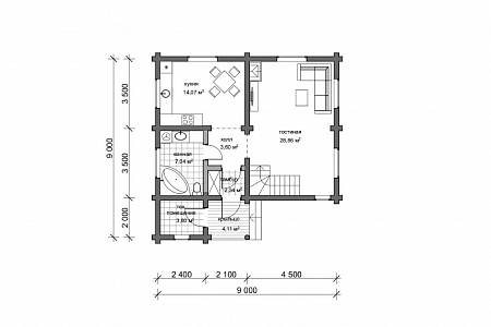 При габаритах 9х9 в доме максимально запланированы необходимые для комфортного проживания помещения. Все «мокрые» помещения совмещены в один узел, что дает экономию на монтаже труб водоснабжения и канализации. В доме организована котельная с отдельным выходом. На первом этаже размещены санузел, кухня, гостиная. В гостиной предусмотрено размещение камина, для дополнительного обогрева, также лестница с забежными ступенями на второй этаж.