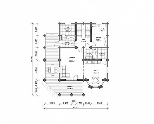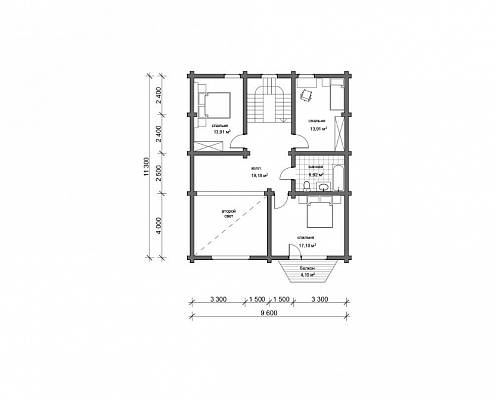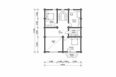 В состав помещений входят – тепловой тамбур, прихожая, техническое помещение. На первом этаже также разместилась жилая комната, а остальное пространство отдано под объединенную кухню-гостиную. Здесь поместится удобный кухонный гарнитур, обеденный стол предлагается разместить в эркере, а в гостиной расположить мягкую зону с просмотром тв. Из кухни есть выход на террасу. Второй этаж отдан под жилые комнаты. Здесь разместились три спальни и санузел. Есть выход на балкончик, с которого в летнее время можно любоваться садом.