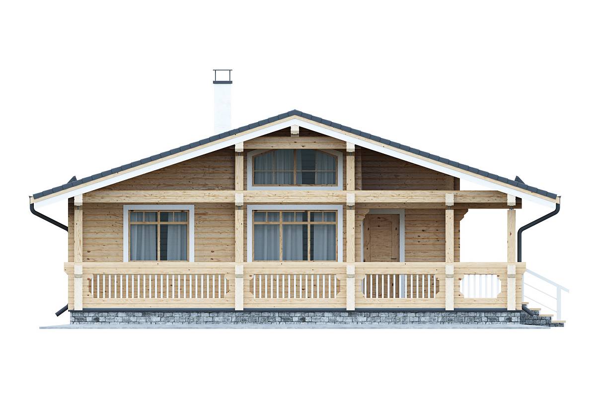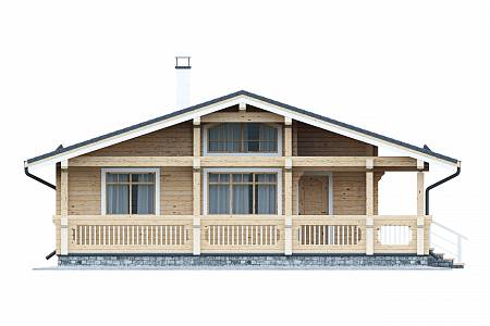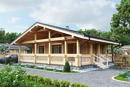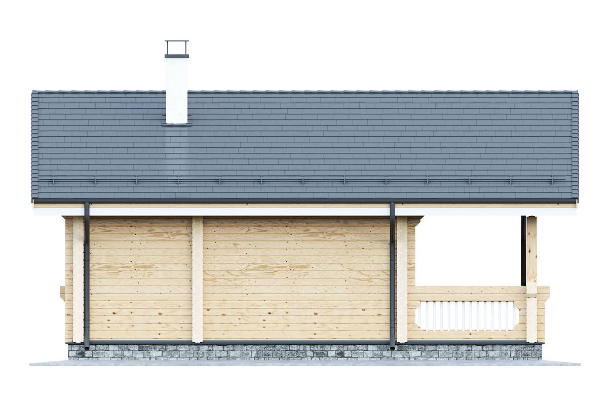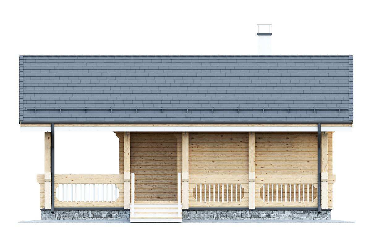 Проект дома из бруса, подойдет для сезонного проживания в виде дачного домика или дома для гостей. Выполнен из профилированного бруса с двускатной теплой кровлей.