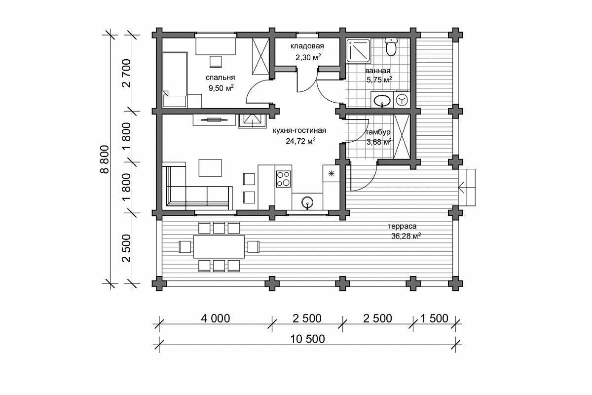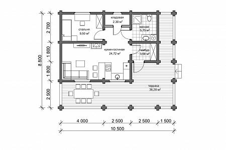 Планировка компактная, включает в себя тепловой тамбур, санузел, кладовую, спальню, объединенное пространство кухни-гостиной, причем кухня установлена в нишу. Дом с двух сторон опоясывает терраса, она защищает от осадков и прямых солнечных лучей, при этом становится излюбленным местом отдыха для семьи и гостей. Широкие свесы кровли защищают от косого дождя, а в зимний период времени защитят от образования наледи у входа и избавят жильцов от постоянной уборки снега.