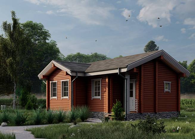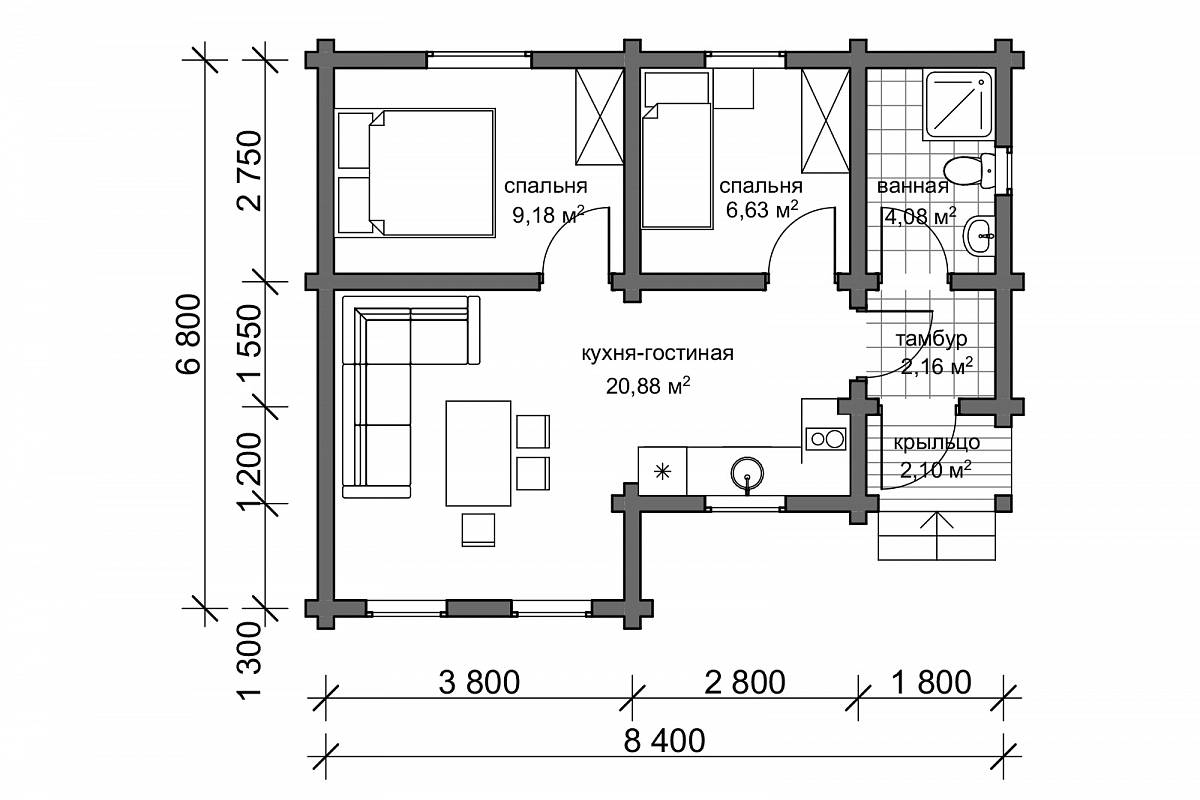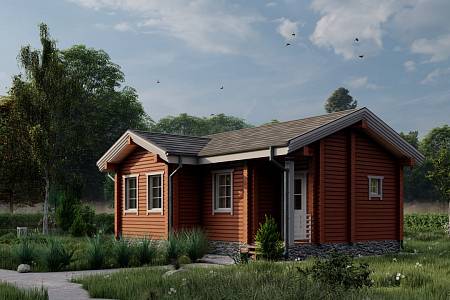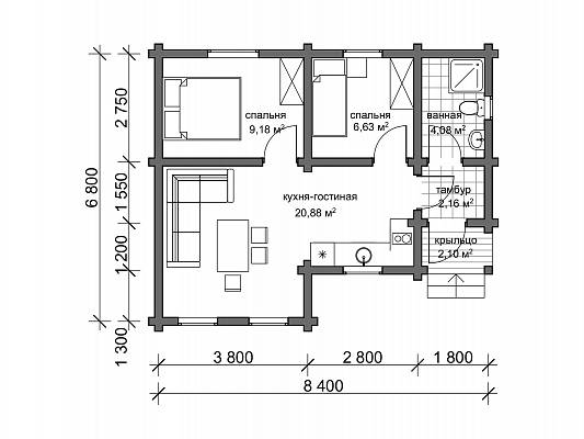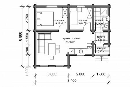 У дома есть крыльцо, защищающее входящего в дом от ветра и осадков. В дом попадаешь через тамбур, который отсекает от жилых пространств холодный воздух. Проектом предусмотрен санузел с возможностью разместить душевую кабину или ванную на ваш выбор. Общее жилое пространство это проходная кухня, совмещенная с гостиной. Площади хватает, чтобы функционально разместился кухонный гарнитур, обеденный стол, мягкая зона для просмотра телевизора. Также при желании в этой зоне можно оборудовать печь-камин с варочной чугунной поверхностью. В доме размещены две отдельные спальни, что удобно для приема гостей или размещения в одной из спален детской комнаты.