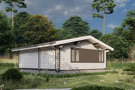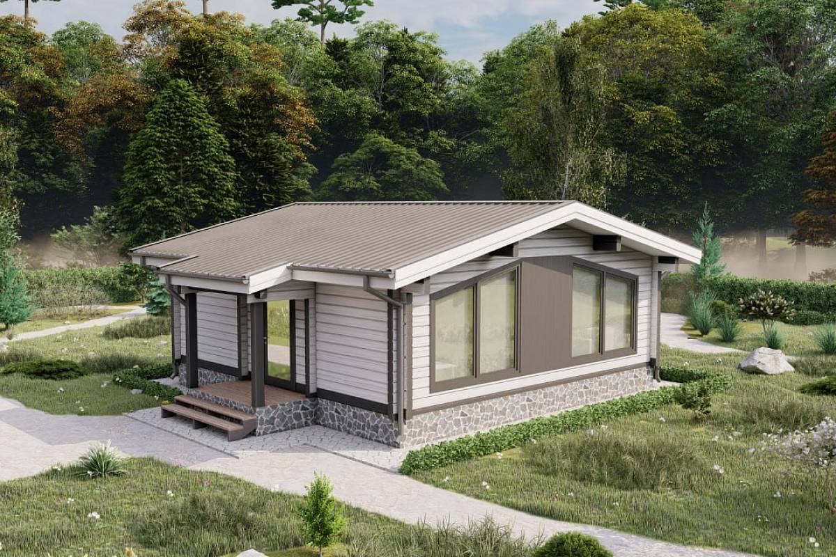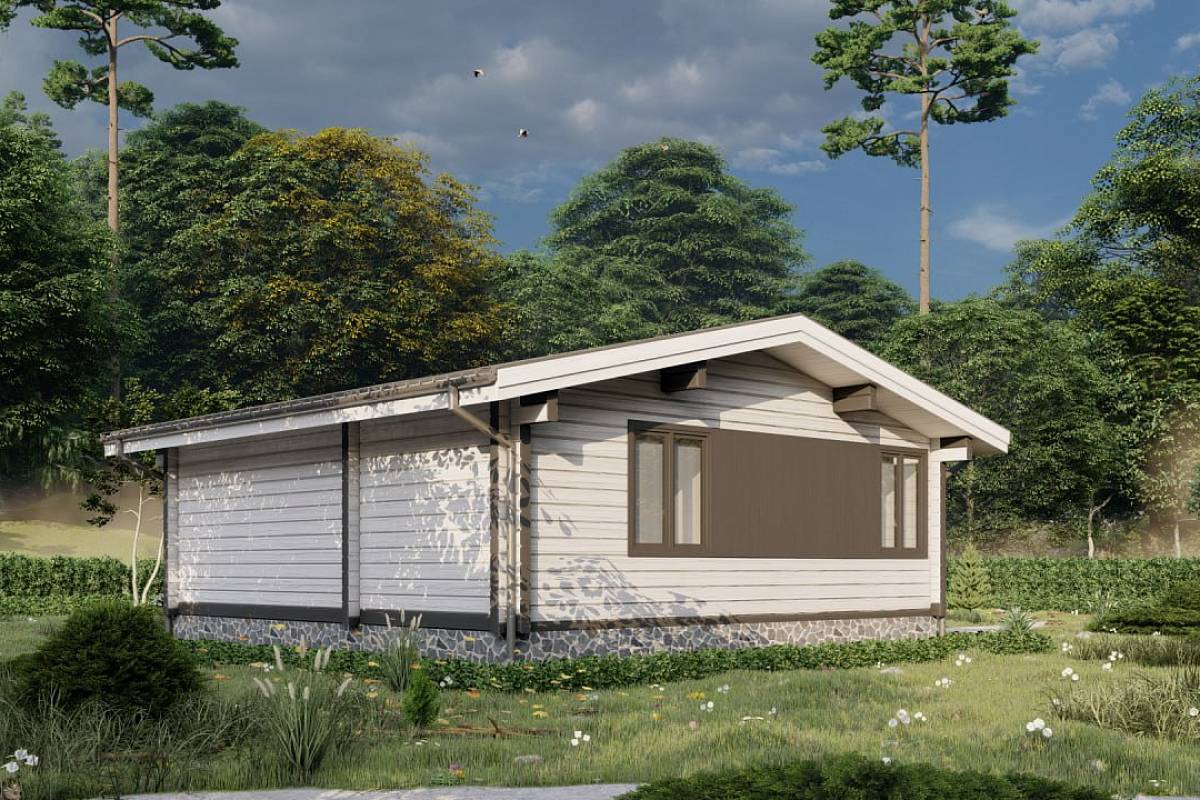 Современный, стильный дом «Тавда» прекрасно впишется в любой ландшафт. На фоне спокойных приглушенных цветов фасада дома графичные элементы выглядят особенно эффектно. Проект компактный, но в нём поместится всё необходимое: есть место для организации и хранения вещей, объединённая гостиная-кухня и две спальных комнаты. В прихожей и в спальнях есть место для вместительных встроенных шкафов. Это позволит сделать большие объемы мебели незаметными в пространстве. Наружные стены – премиальный клееный брус 160*185 мм. Преимущества: Современный экстерьер Две спальни Планировка без коридоров