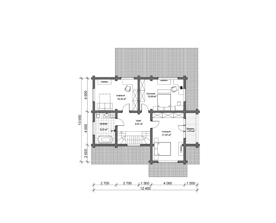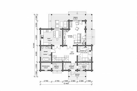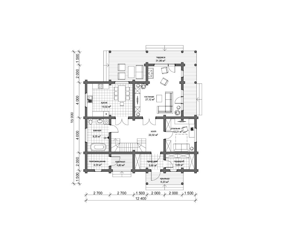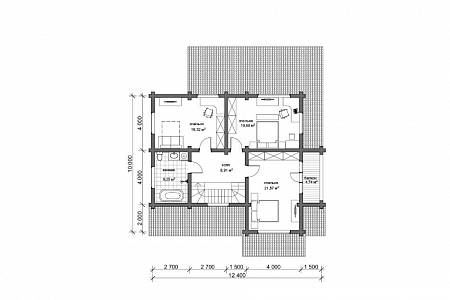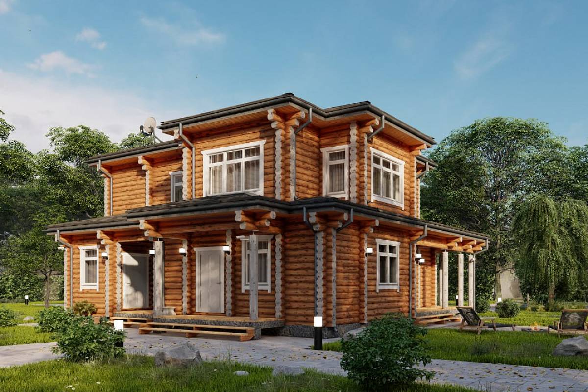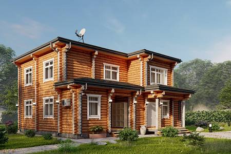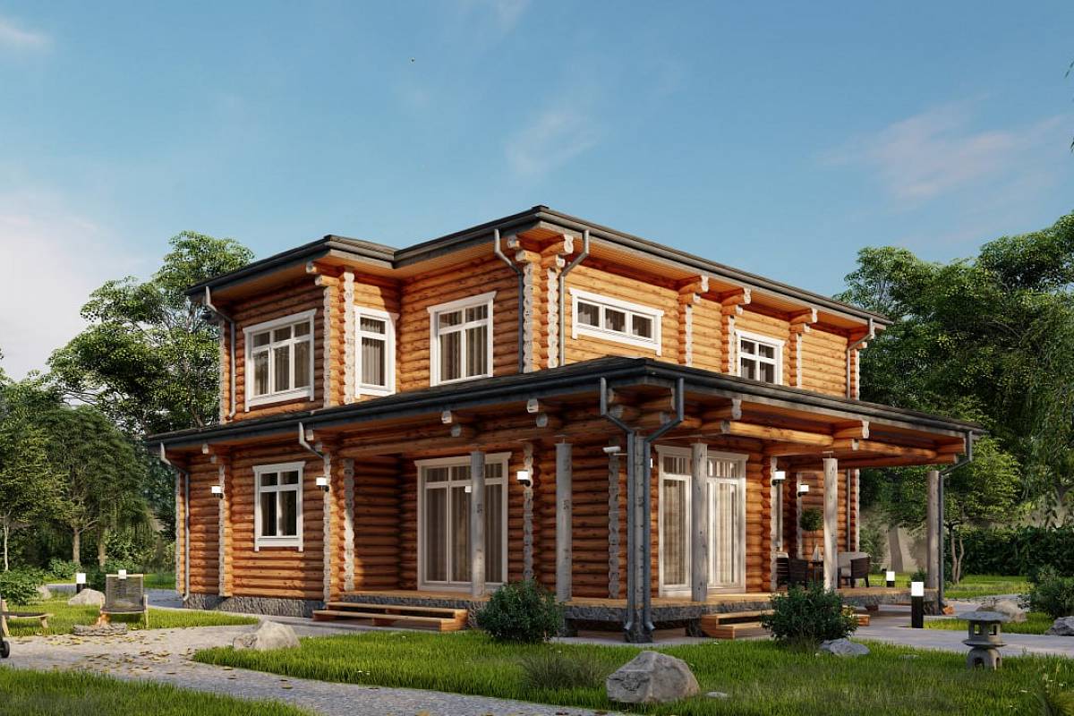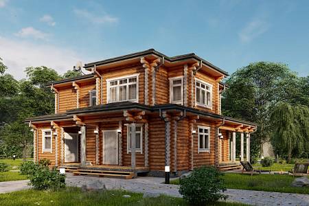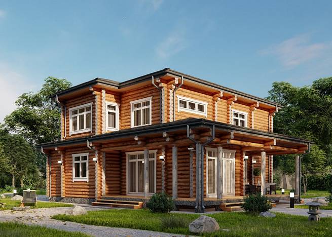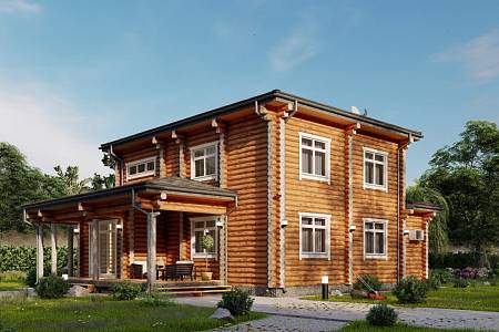 Проект деревянного дома, выполнен из оцилиндрованного бревна, имеет непривычную архитектуру для деревянного дома, так как спроектирован с двумя полноценными по высоте этажами.